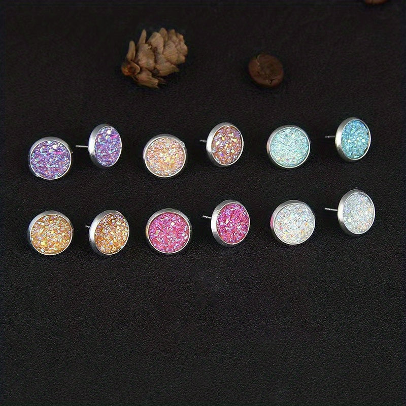 Add a pop of color and sparkle to your outfit with this set of 6 round sequin stud earrings. Each earring features a crystal cluster disc design, perfect for adding a touch of delicacy to your party look. Makes a great gift for any jewelry lover.