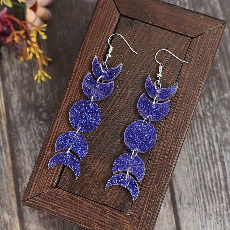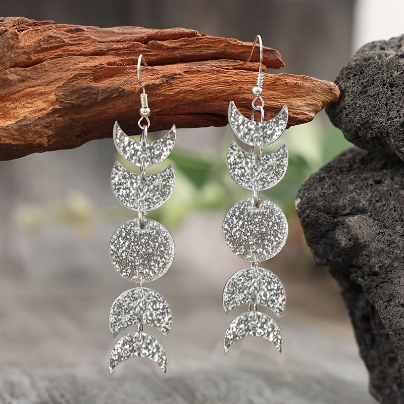 Add a touch of creativity to your outfit with these long earrings featuring crescent moon and circle sequins made of acrylic material.