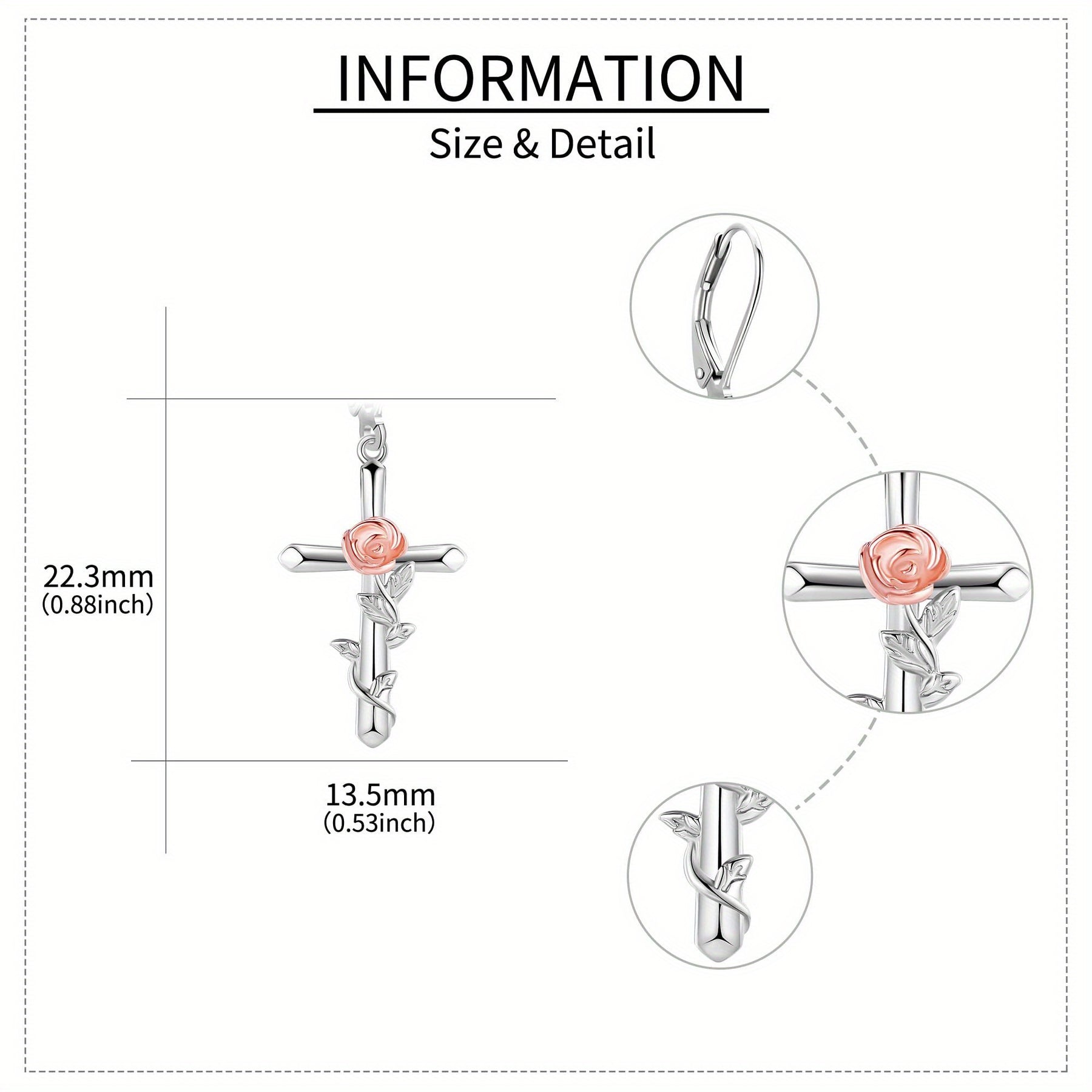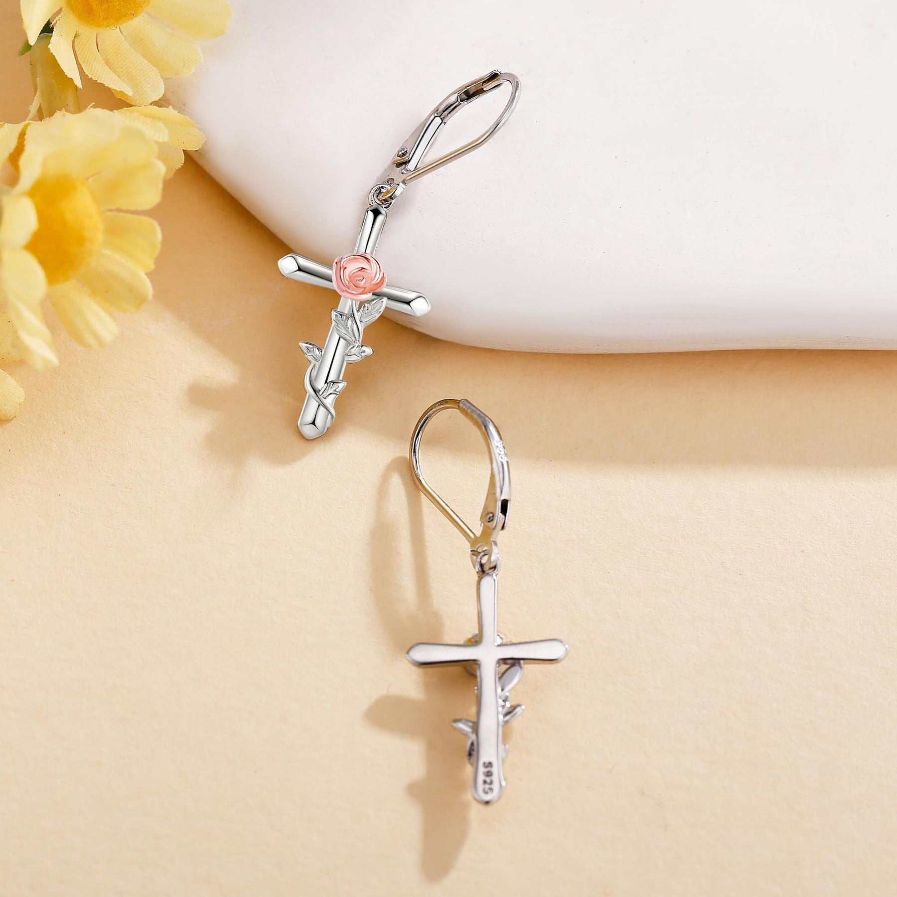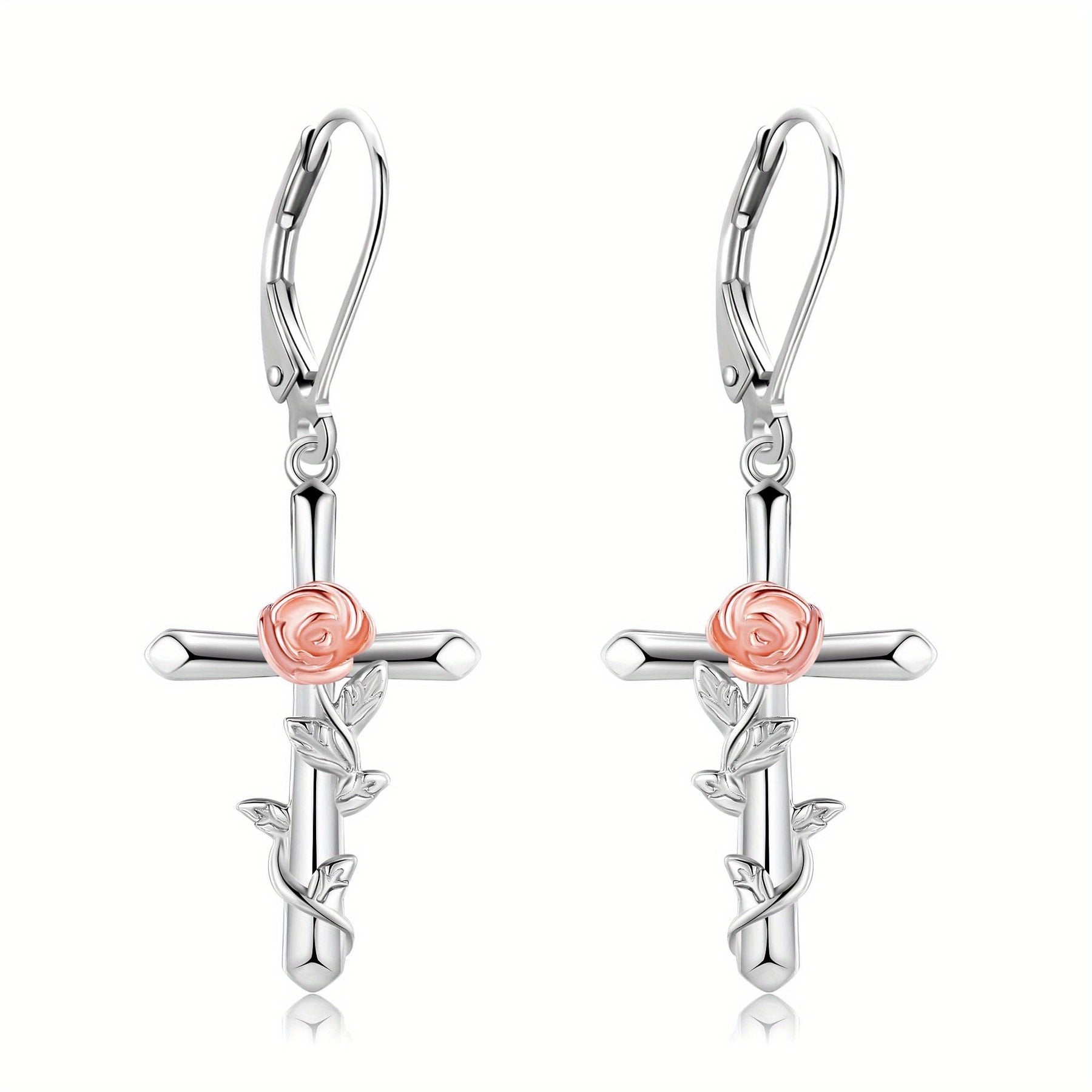 These beautiful sterling silver earrings feature a cross design with a delicate rose flower accent. Perfect for everyday wear or special occasions.