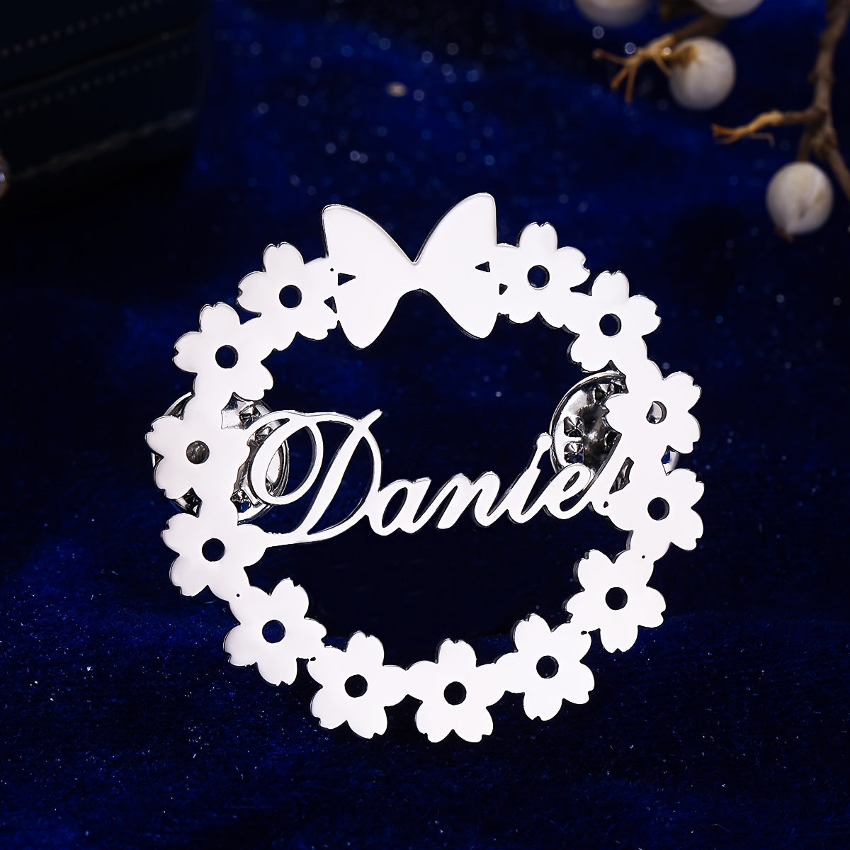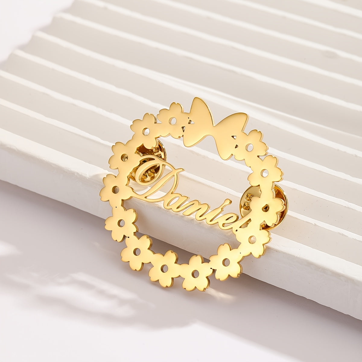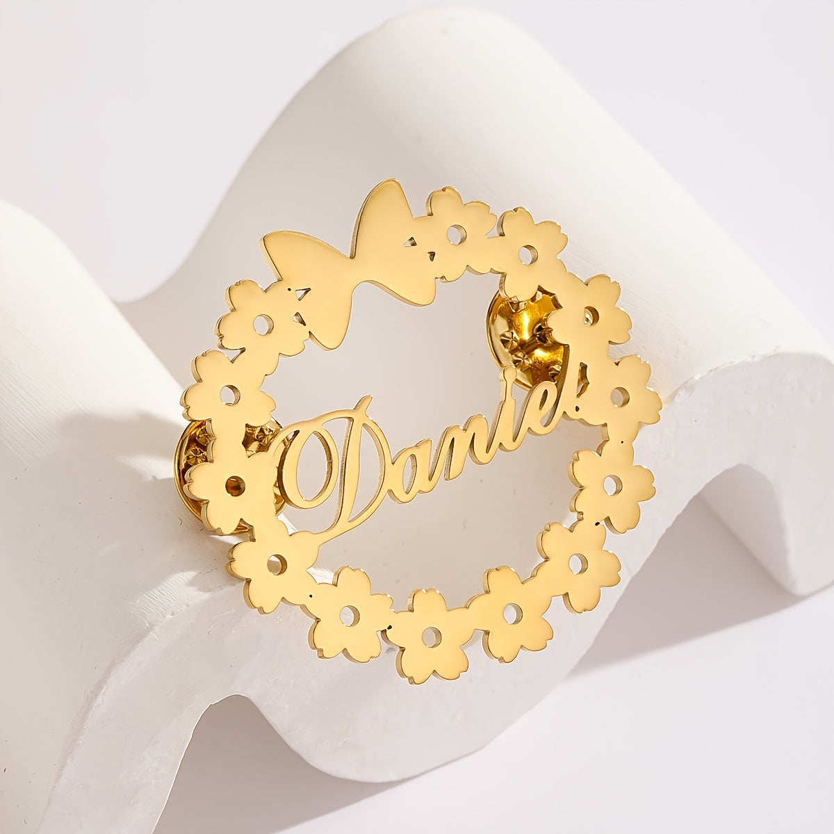 Elegant stainless steel brooch with butterfly and flower wreath design personalized with your name. Ideal Christmas gift for women to enhance outfits.
