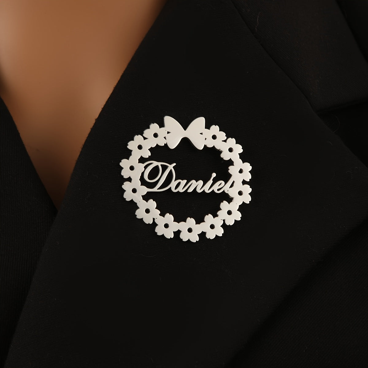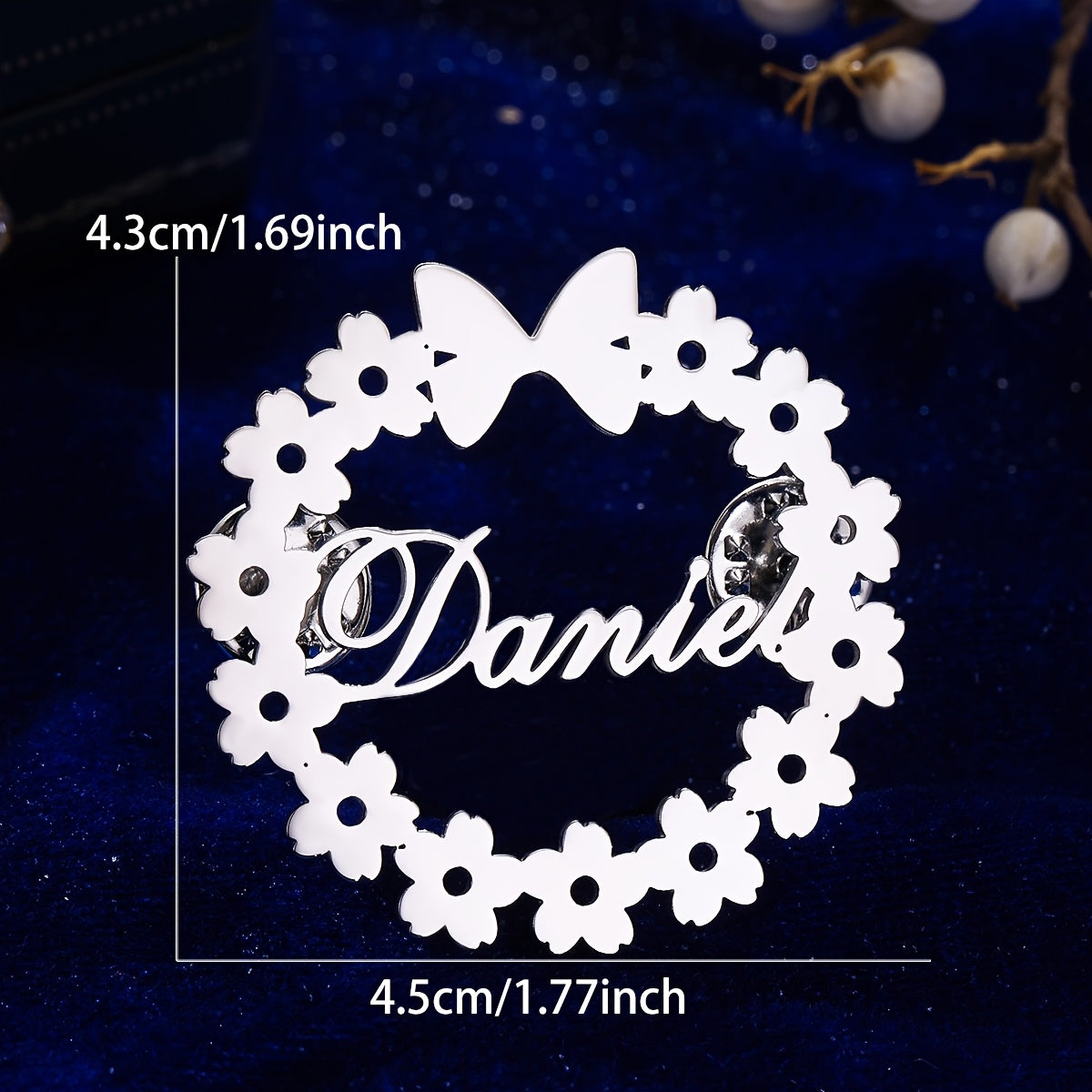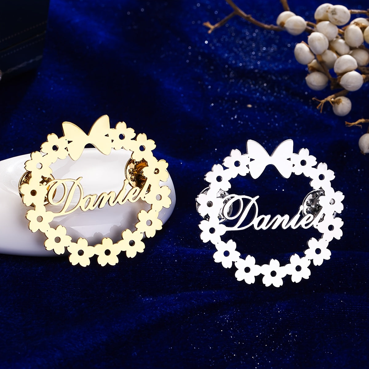 Elegant stainless steel brooch with butterfly and flower wreath design personalized with your name. Ideal Christmas gift for women to enhance outfits.