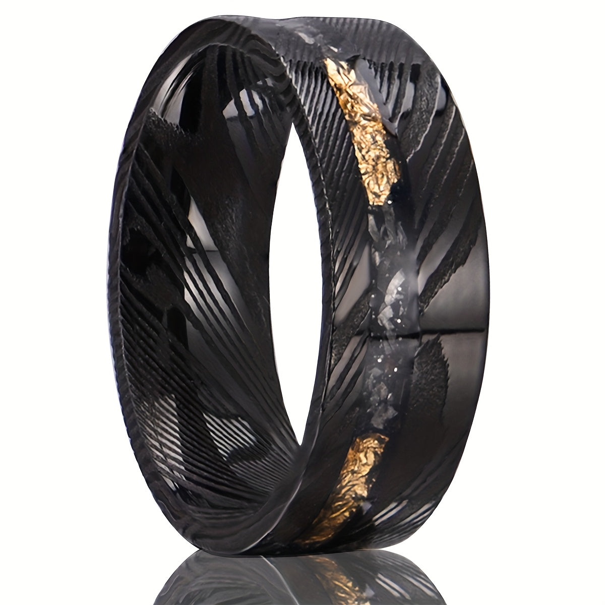 Damascus Steel Men's Wedding Band 8mm Comfort Fit Ring with Golden Accents