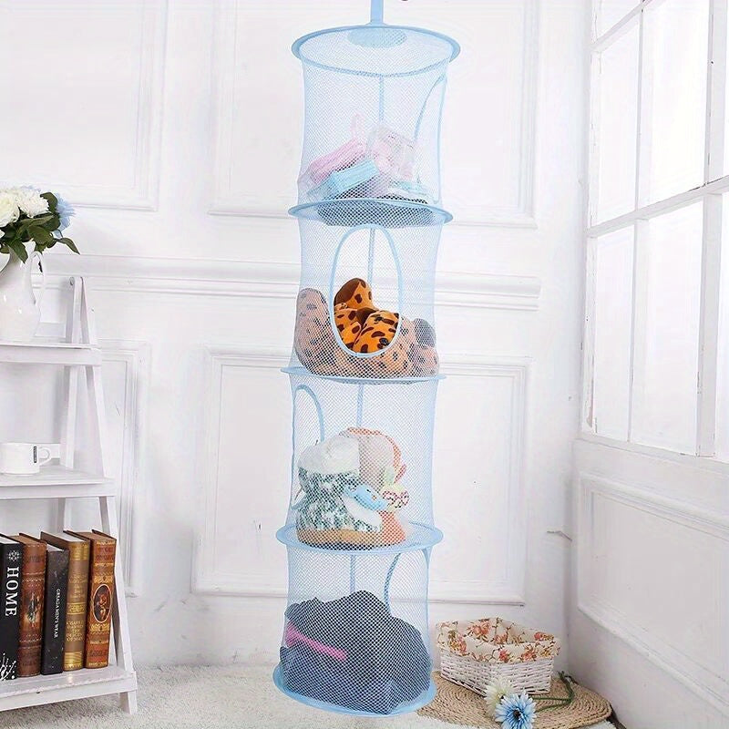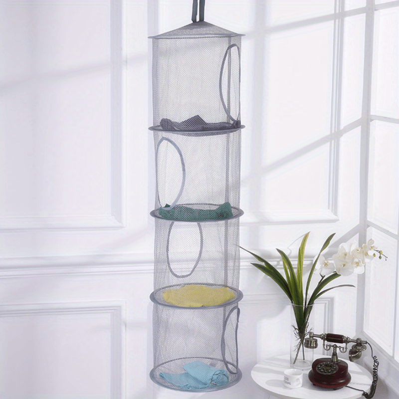 This hanging basket is foldable, breathable, and has four grids for organizing plush toys, underwear, or for drying clothes. It's a versatile storage solution that can be hung anywhere in your home.