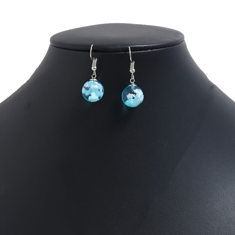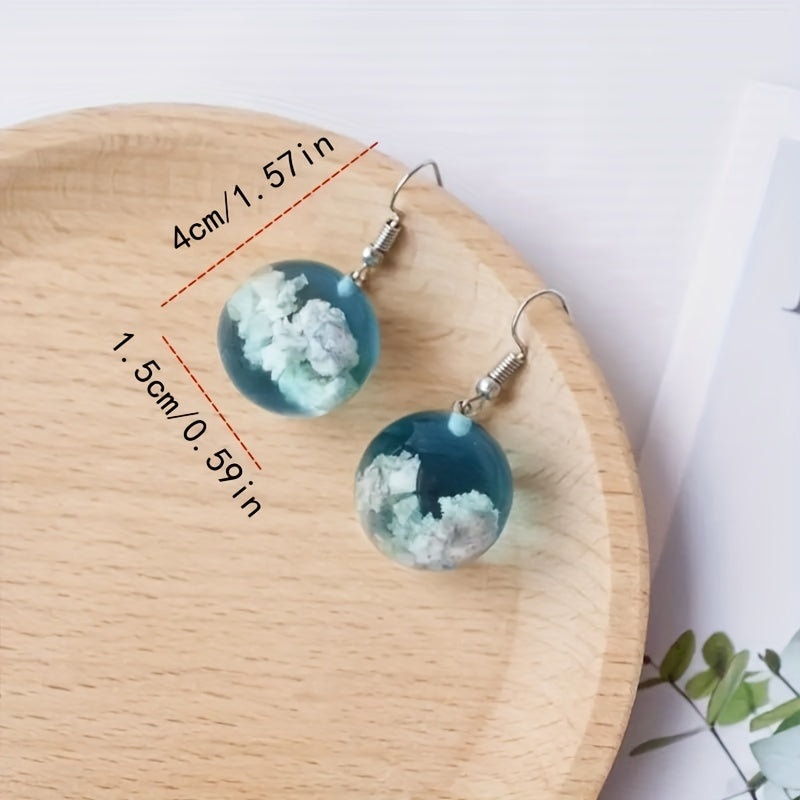 Add a touch of whimsy to your look with these unique earrings featuring sky and cloud designs encapsulated in transparent resin balls.