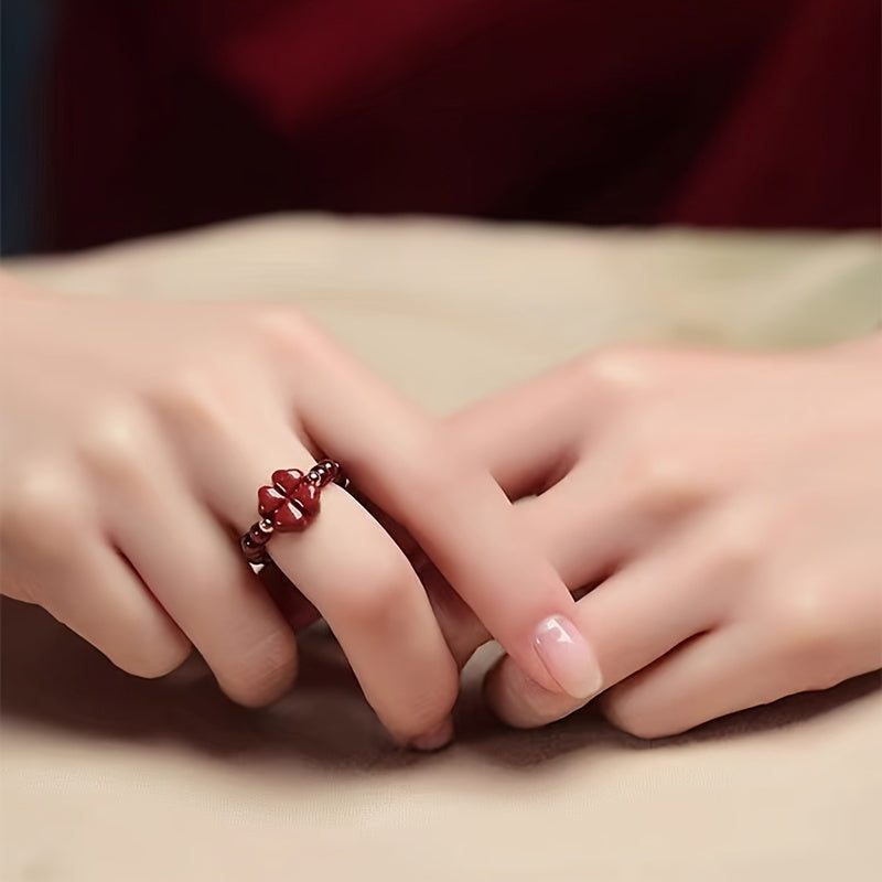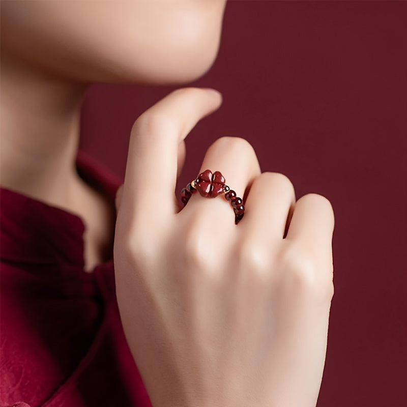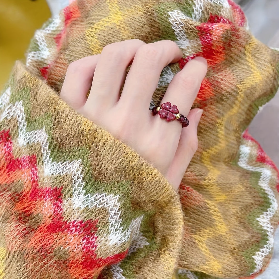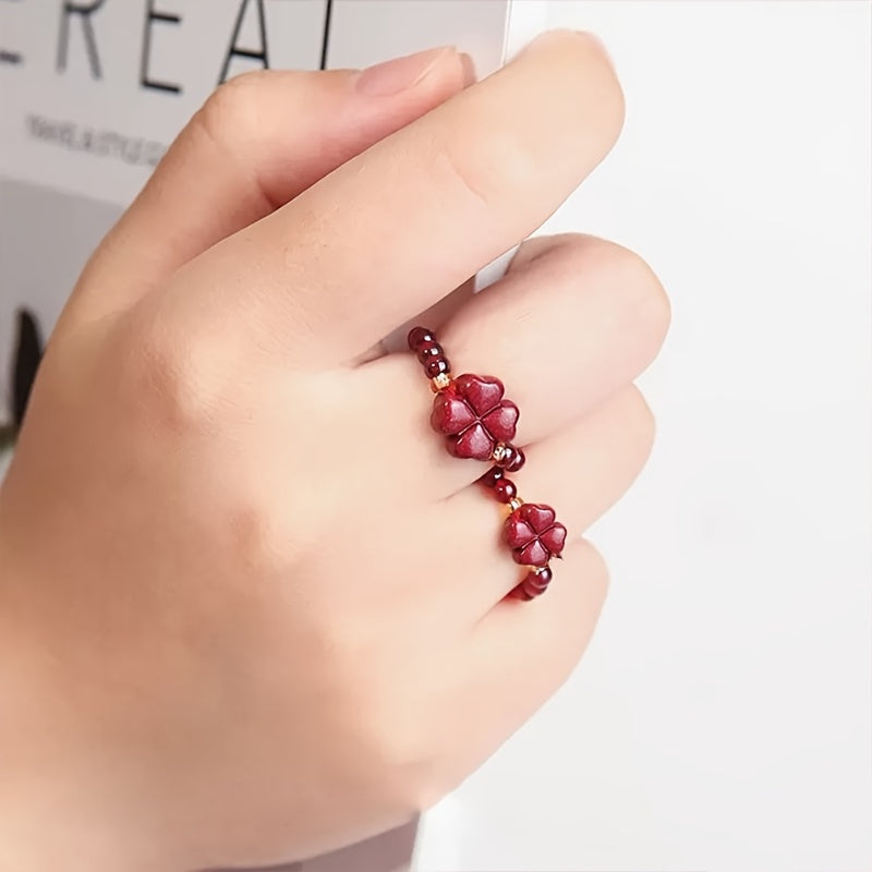 This lucky clover ring features garnet beads and a stretchy braided design, perfect for casual wear. An ideal Valentine's Day gift.