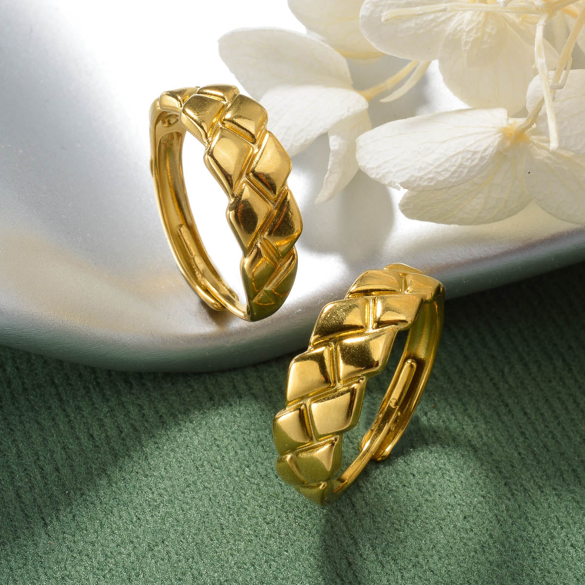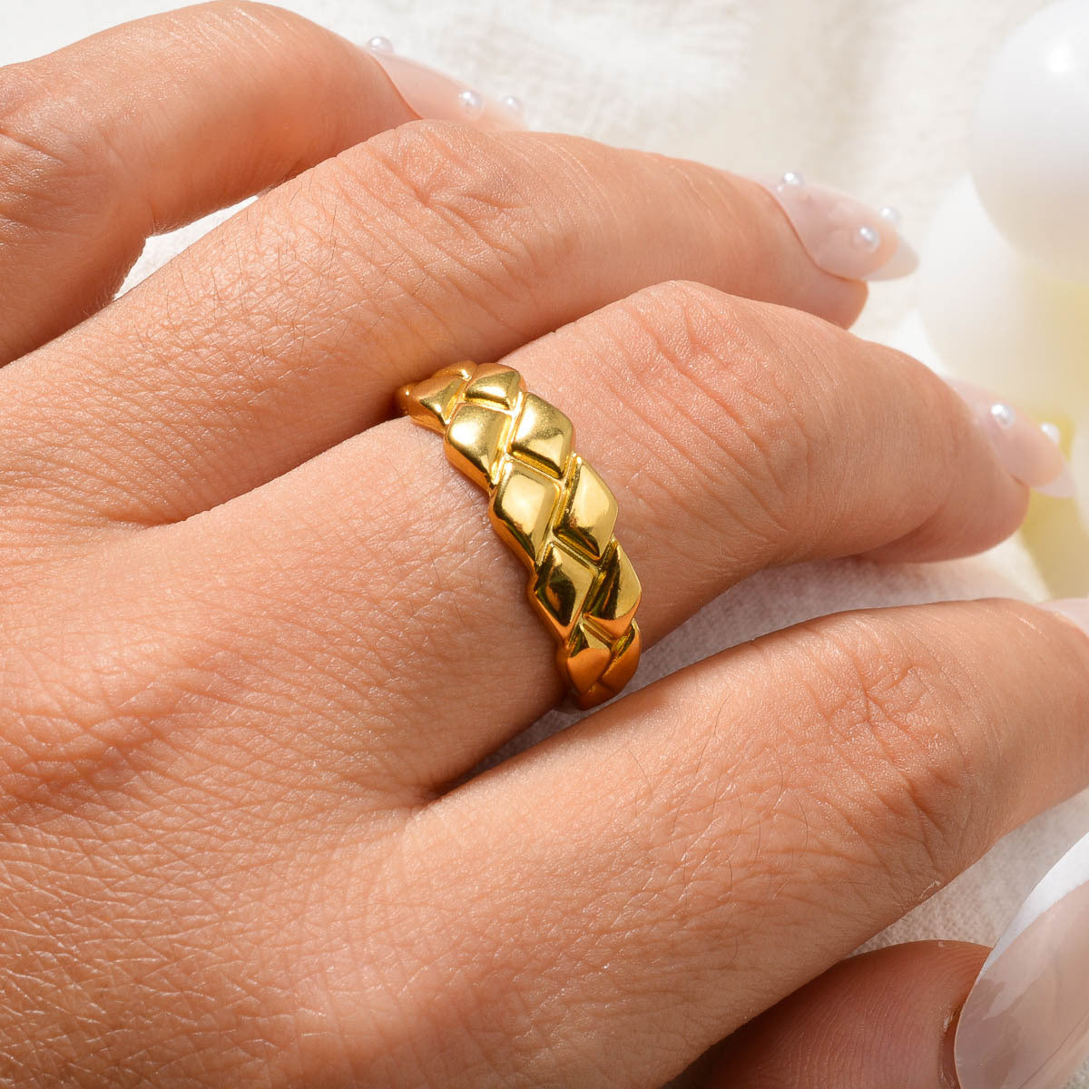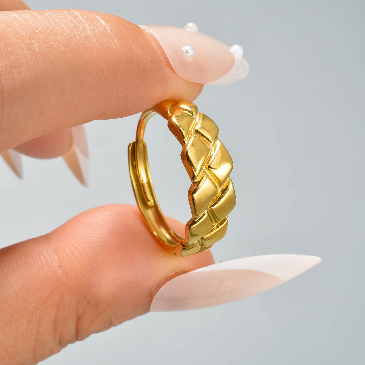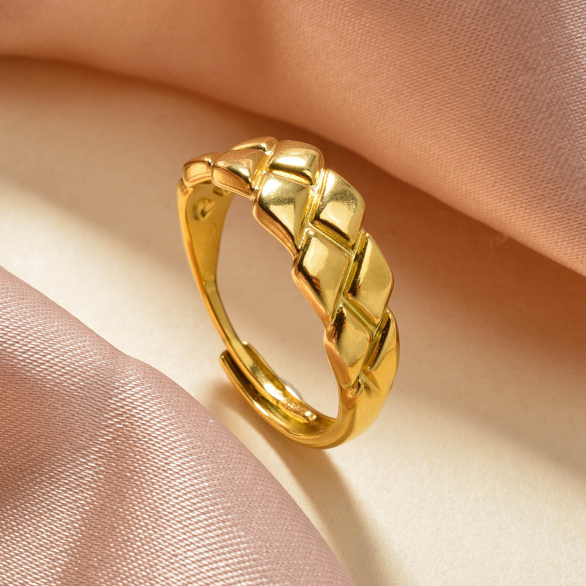 This stainless steel ring features a minimalist geometric textured design that is durable for everyday wear. It is suitable for both casual and formal outfits for men and women.