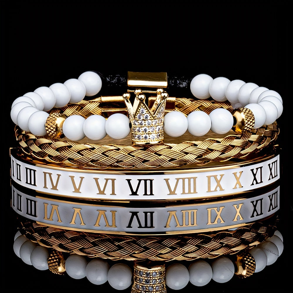 This stylish bracelet features a crown charm and a golden skull design. Made of high-quality stainless steel with enamel detailing and Roman numerals. Perfect for men who appreciate unique jewelry.