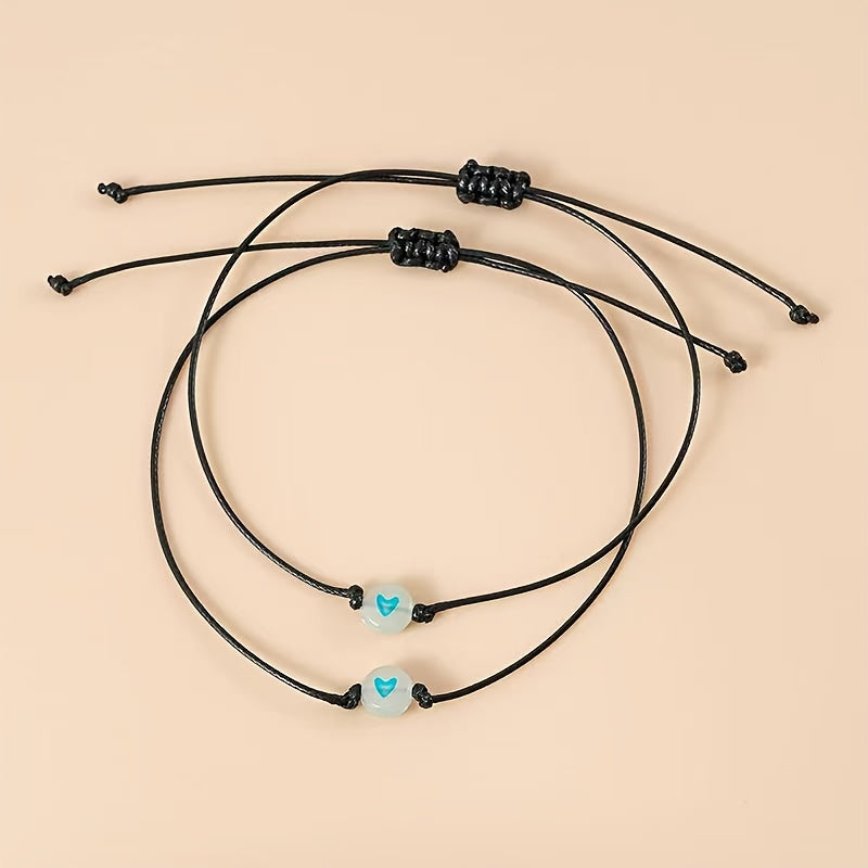 This glowing bracelet features heart shaped luminous beads on a woven chain. It is perfect for women, men, or couples looking for a casual accessory. Available in 6 vibrant colors.