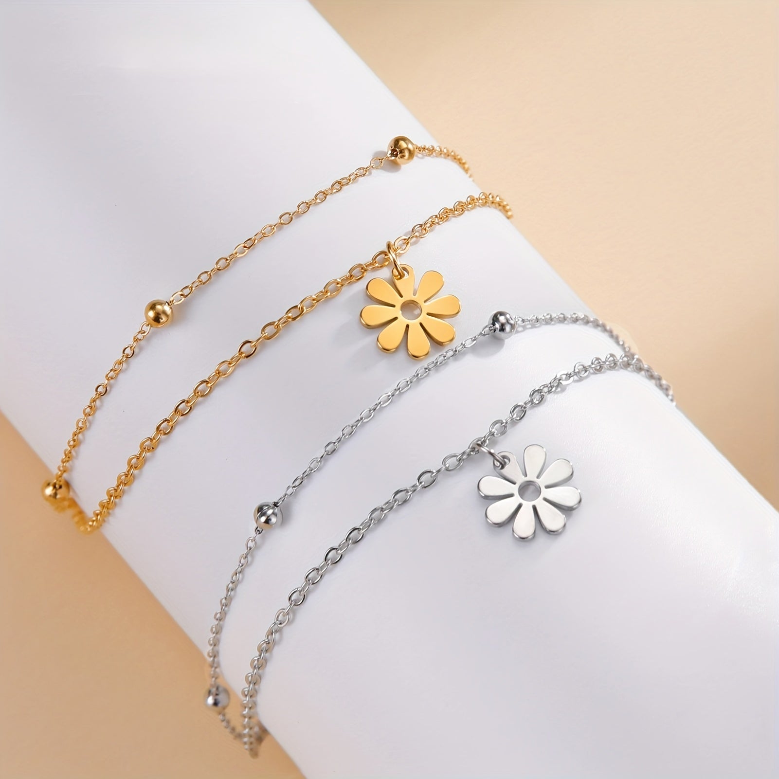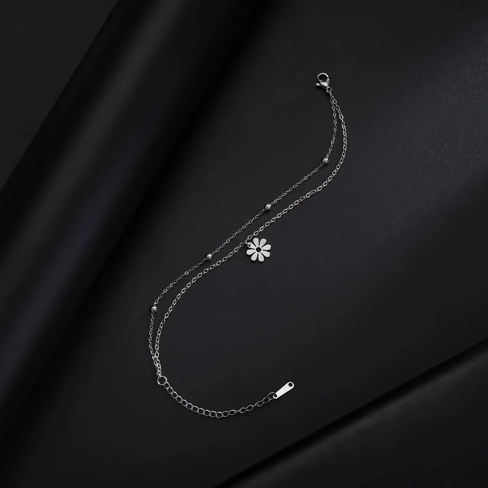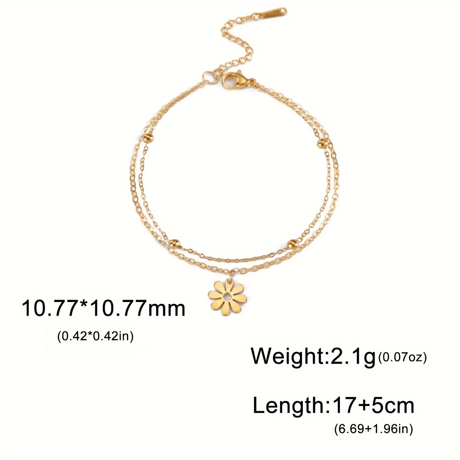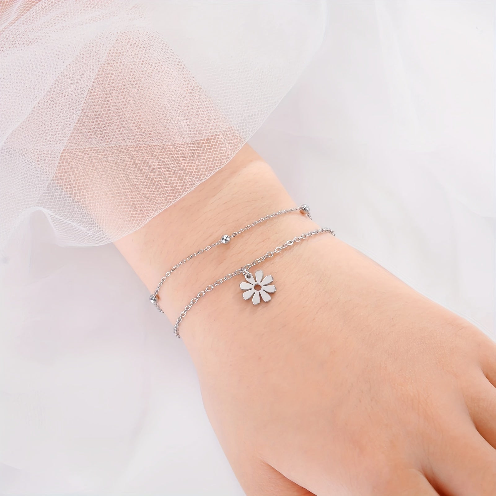 This stainless steel bracelet features a daisy charm design and an adjustable chain. It has a polished finish for a sleek look.