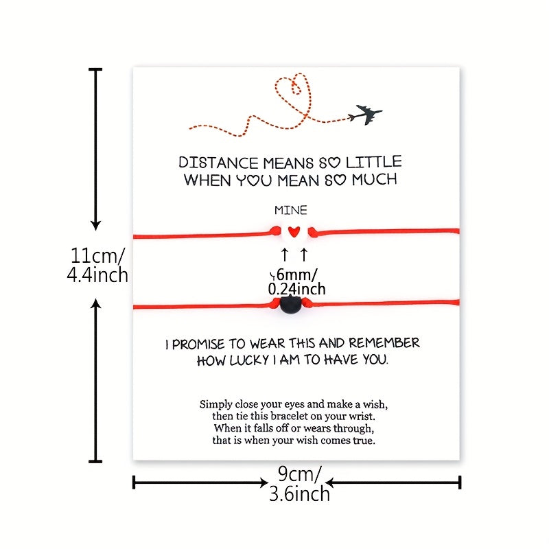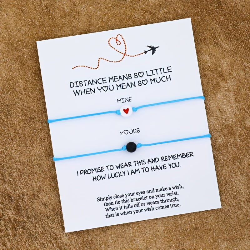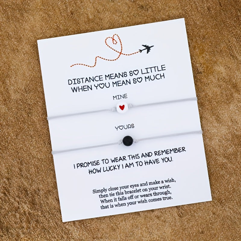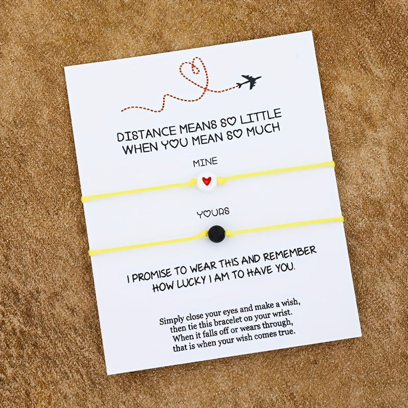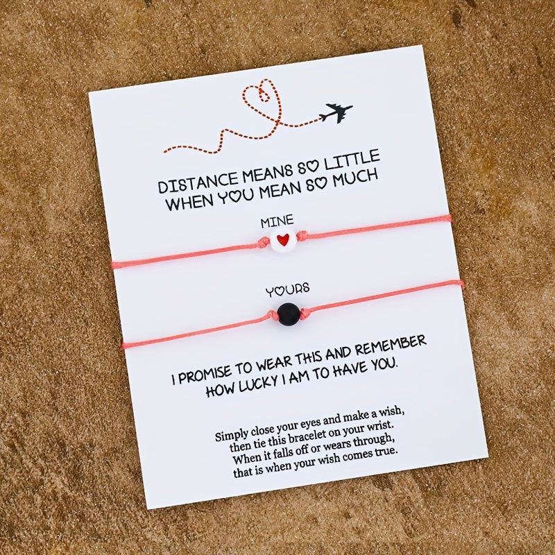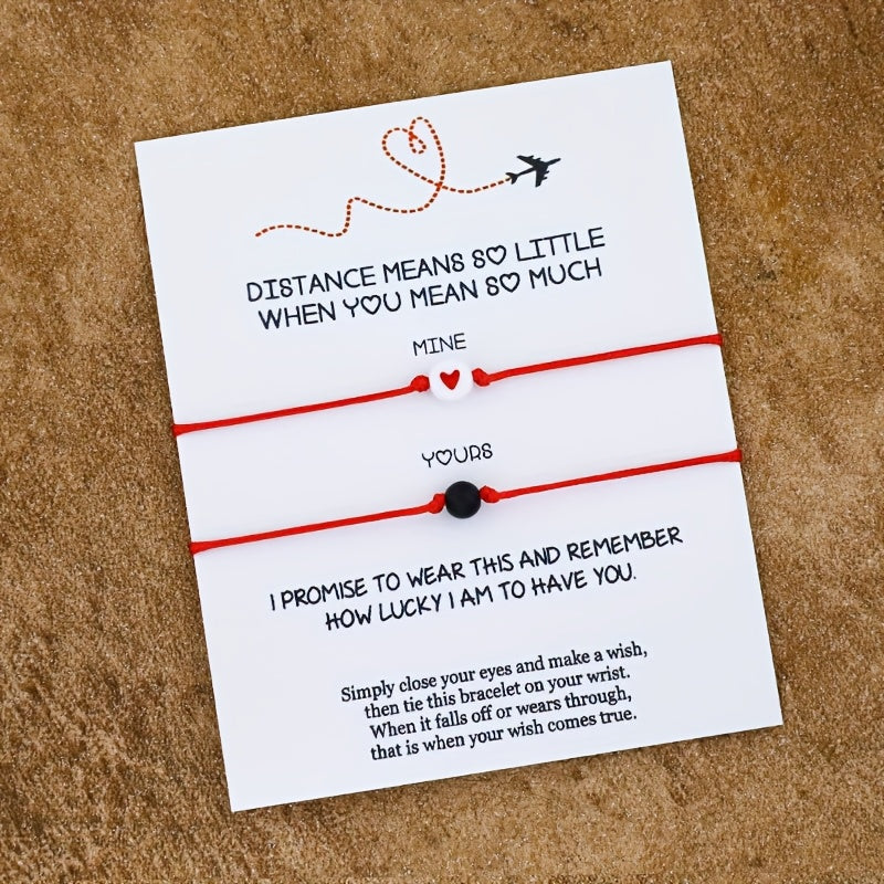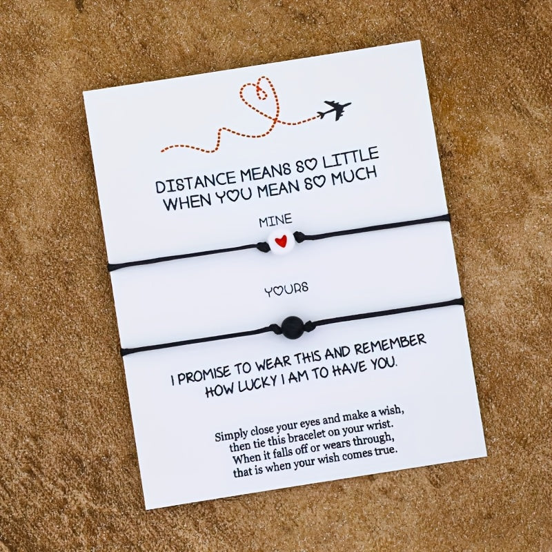 Pair of Long Distance Wish Bracelets featuring heart-shaped glass beads, perfect for men and women. Show your commitment with these Promise Bracelets as an Anniversary Gift.