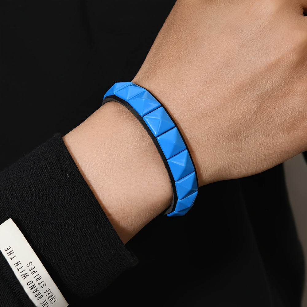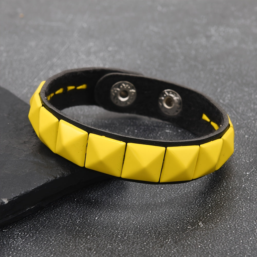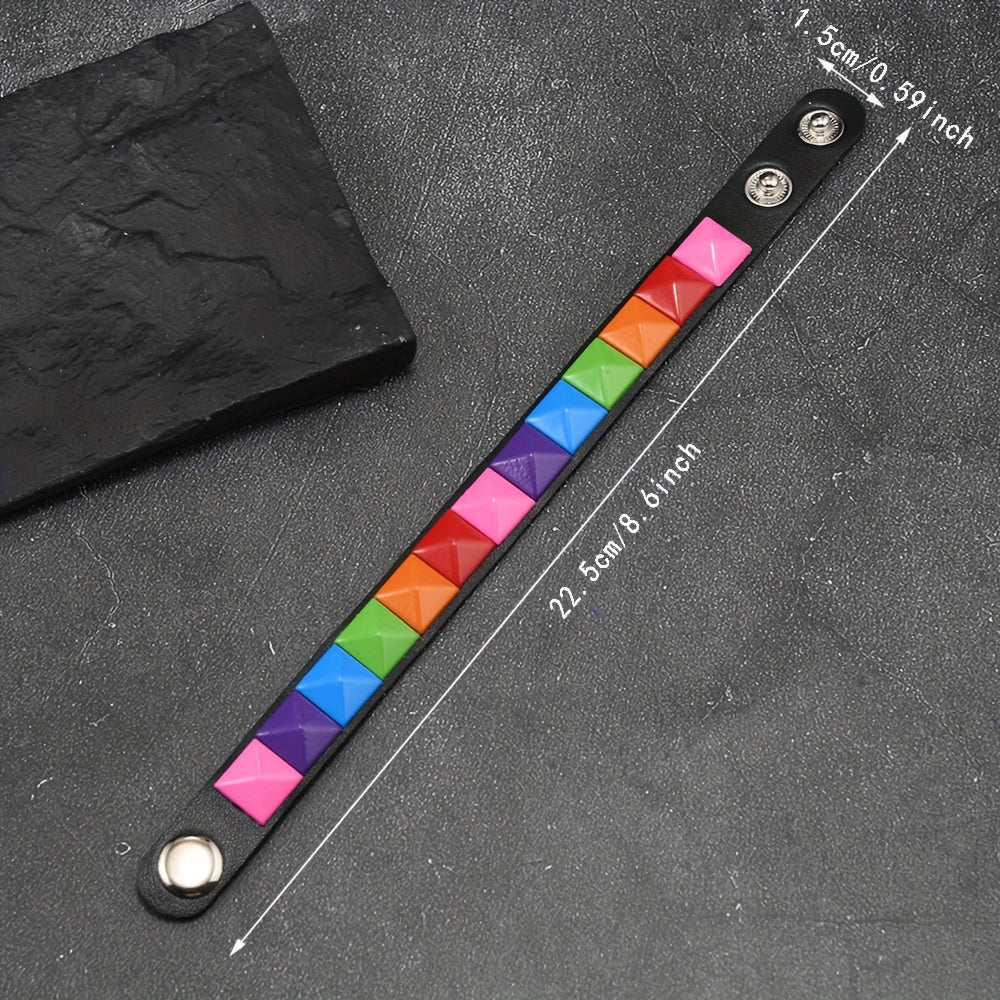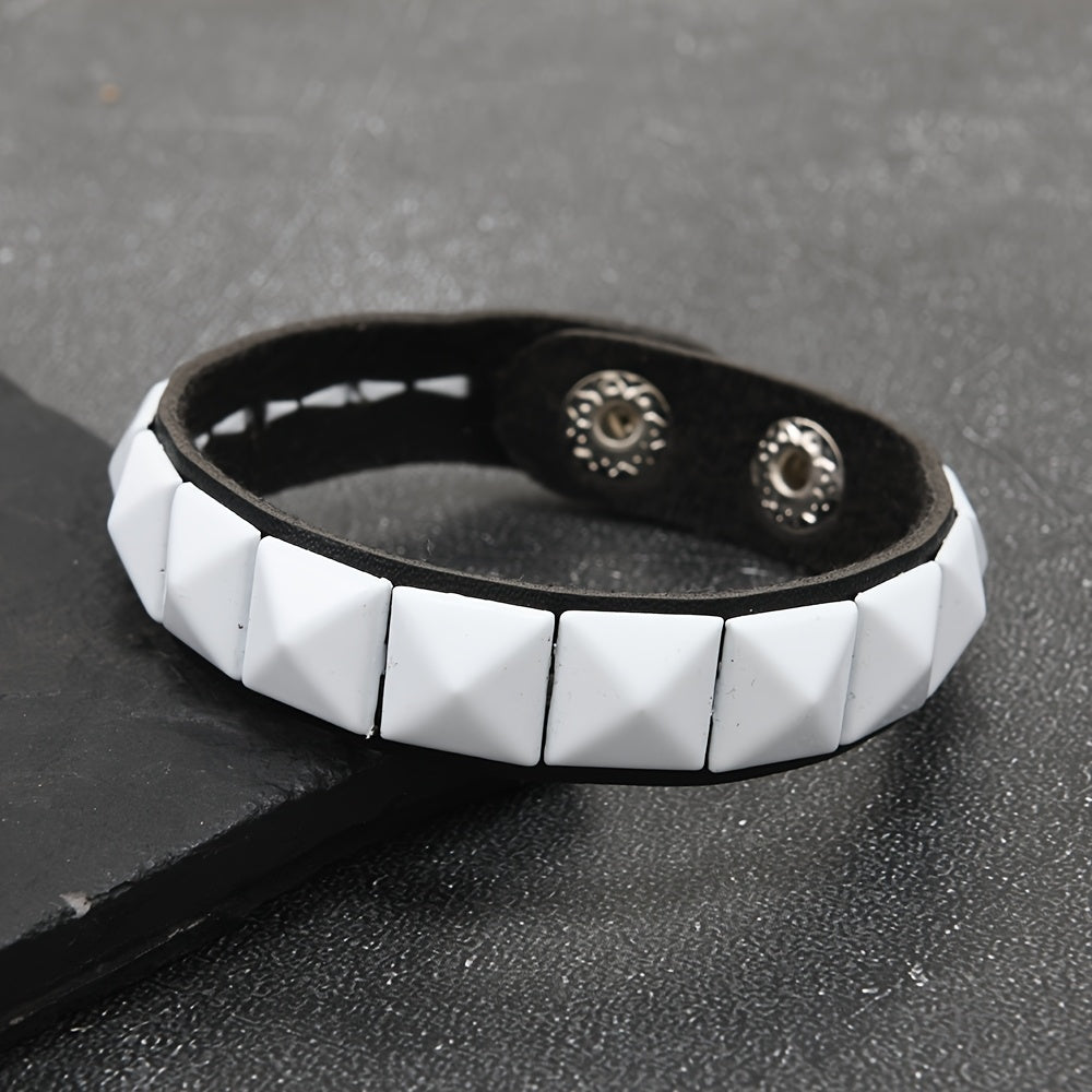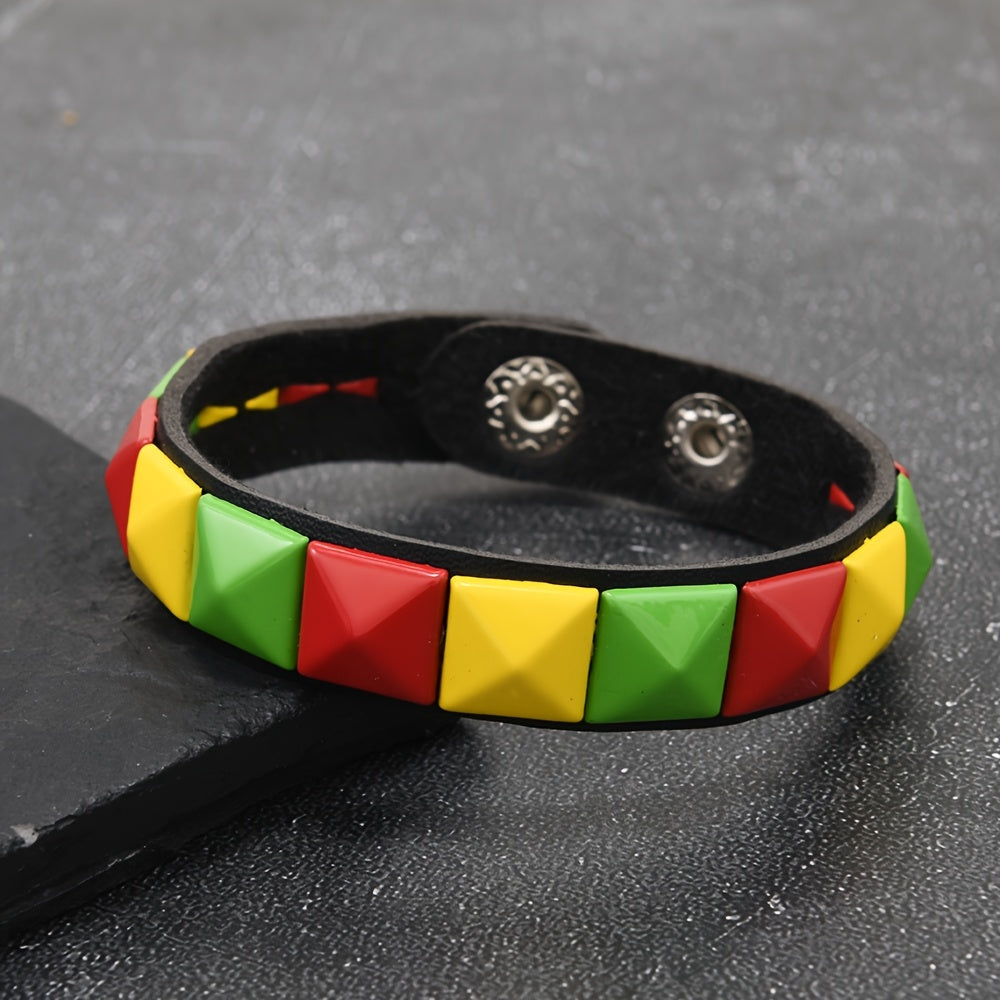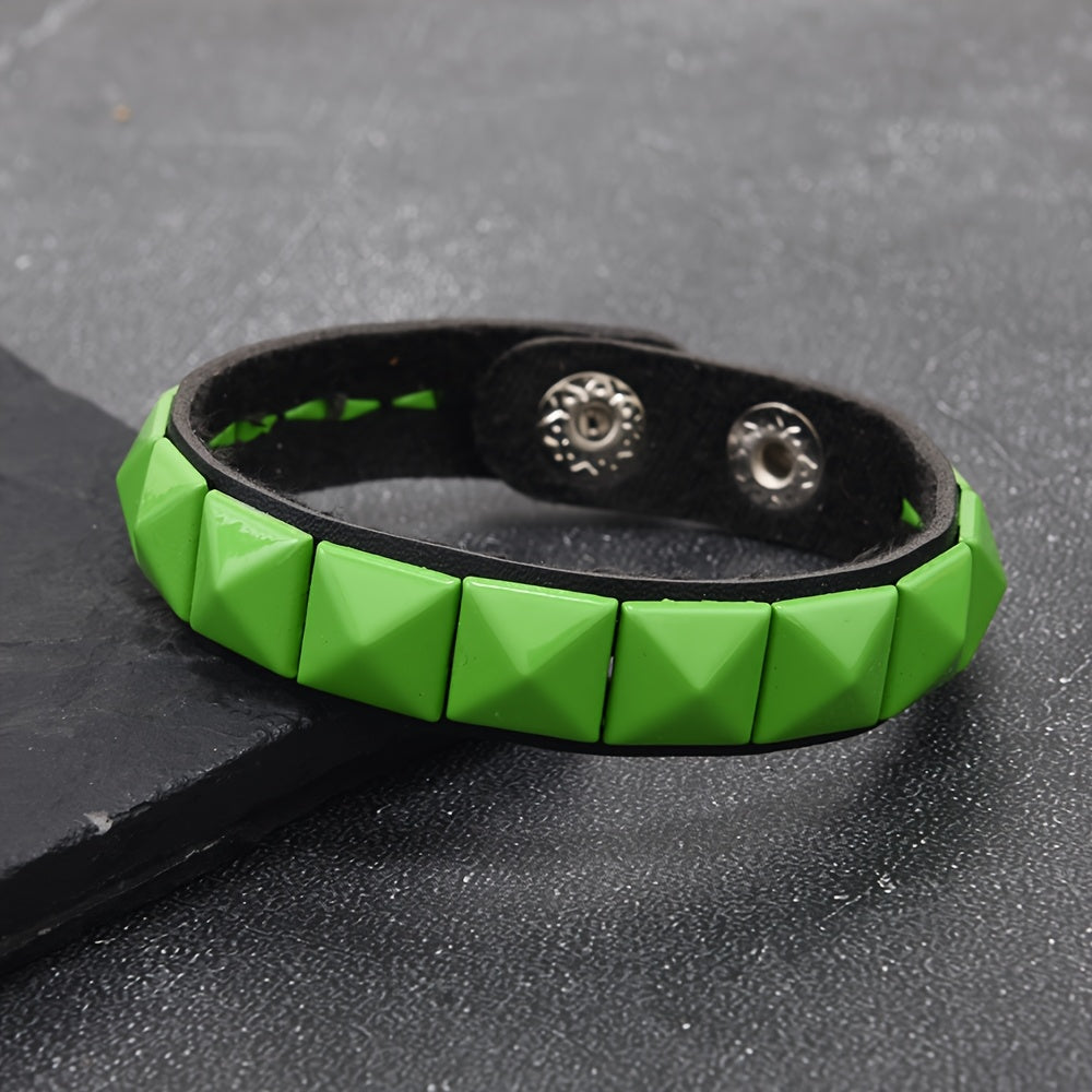 Perfect accessory for holidays, parties, and St. Patrick's Day celebrations, this faux leather bracelet features a stylish square buckle. Available in grey and beige colors.