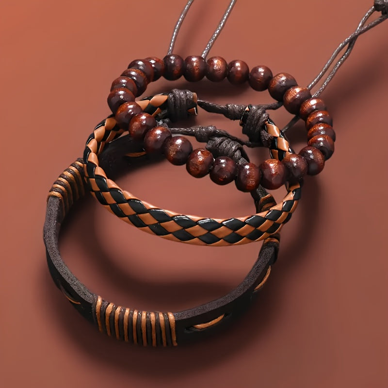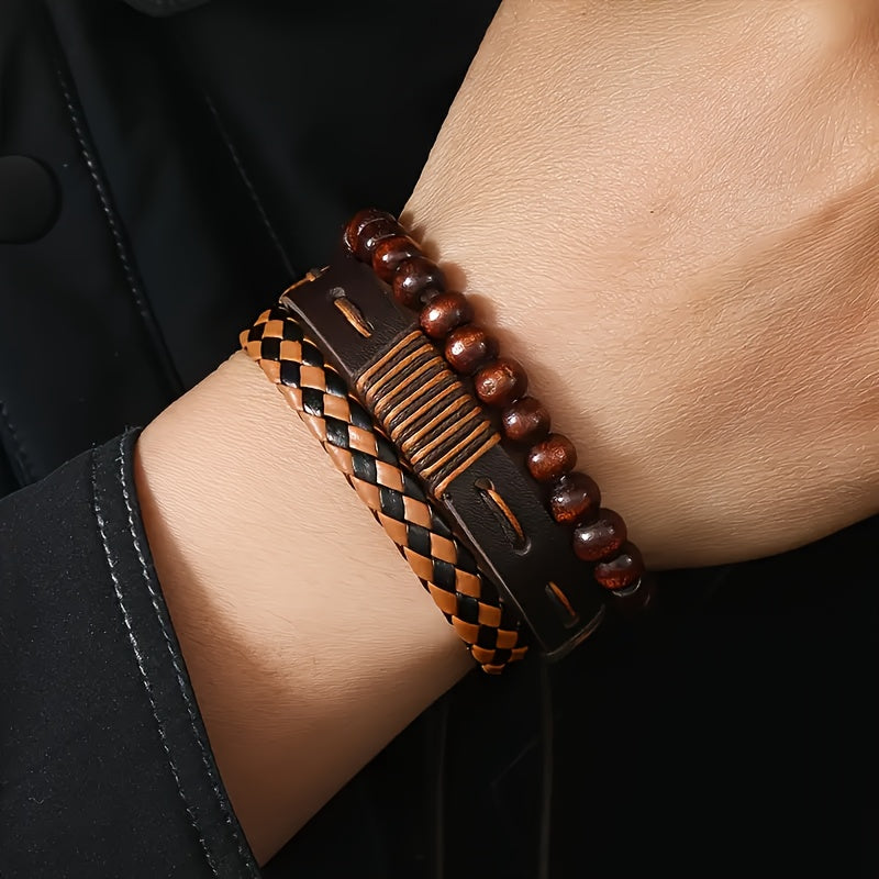 This stylish faux leather bracelet features a combination of beaded, woven, and checkered designs. Perfect gift for couples or fashion-forward individuals.