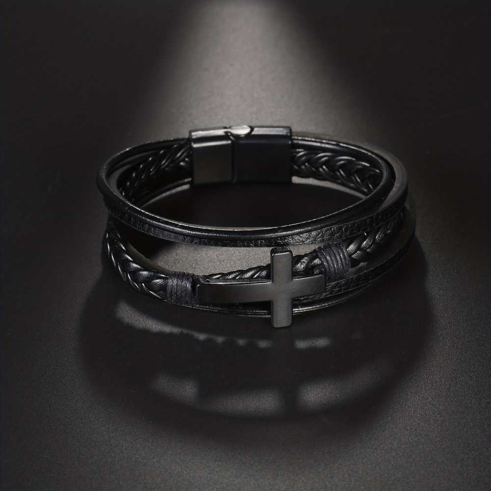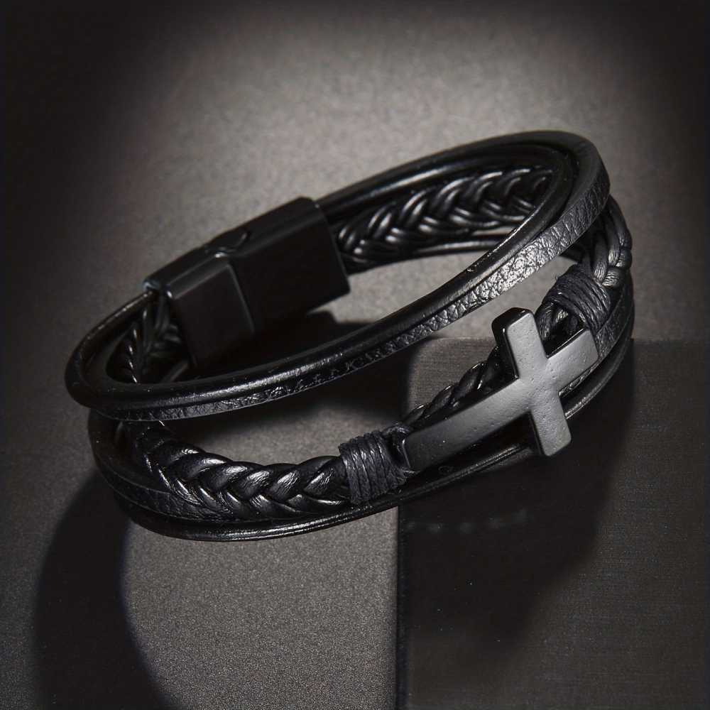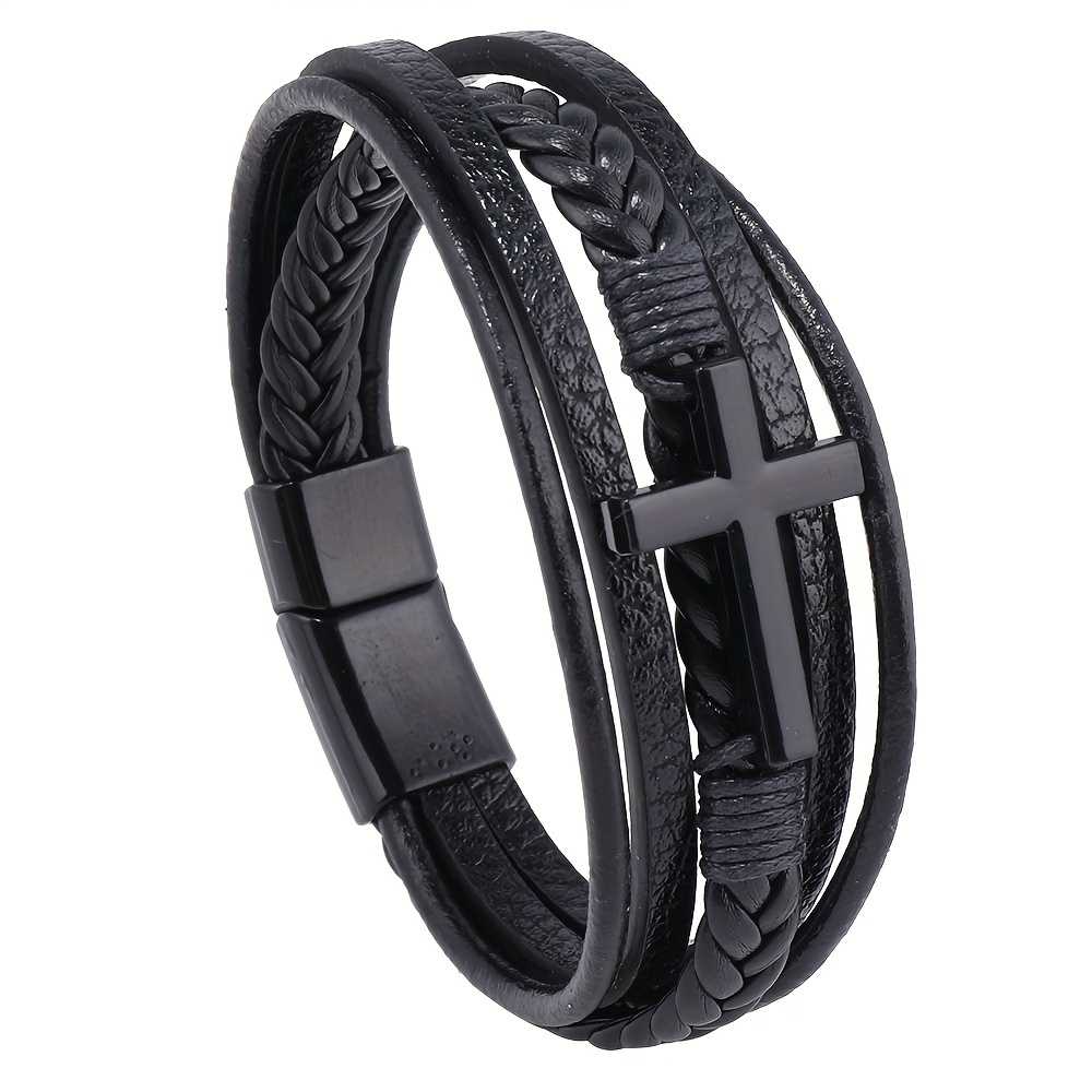Men's Cross Design Multi Layer Black Leather And Steel Magnetic Bracelet