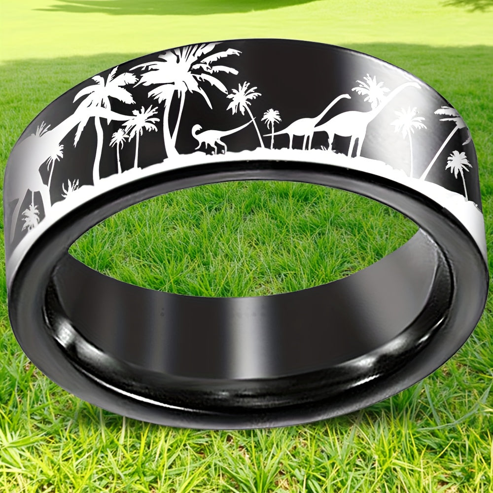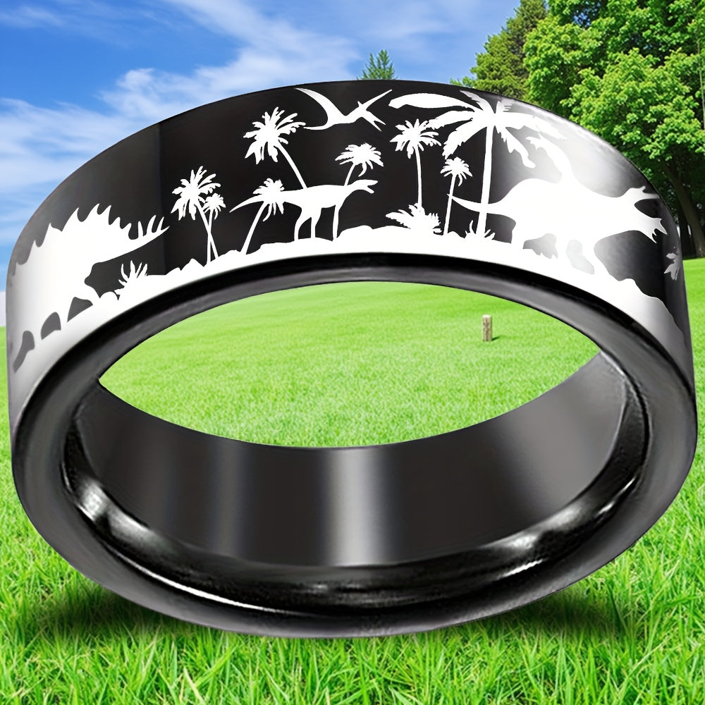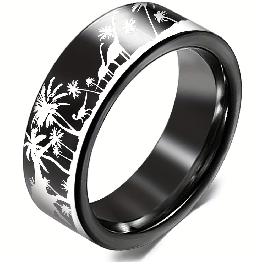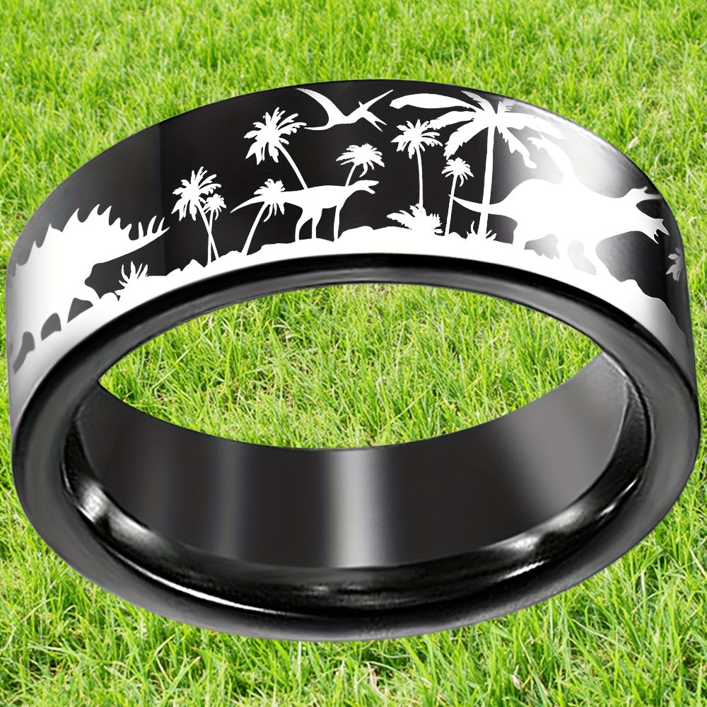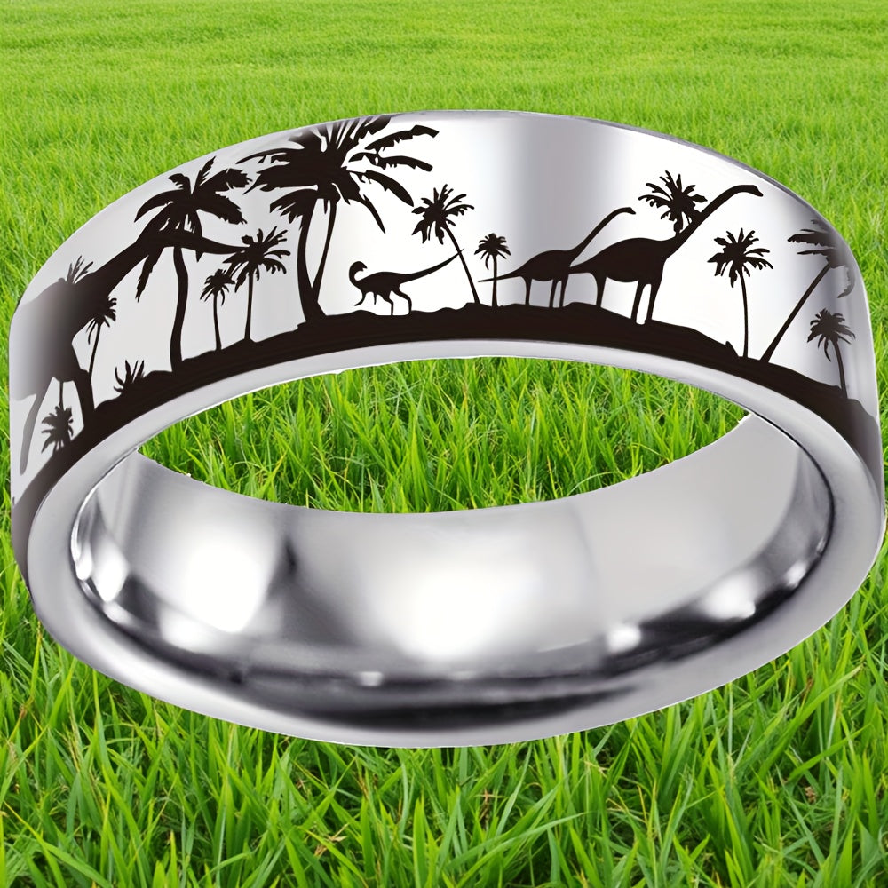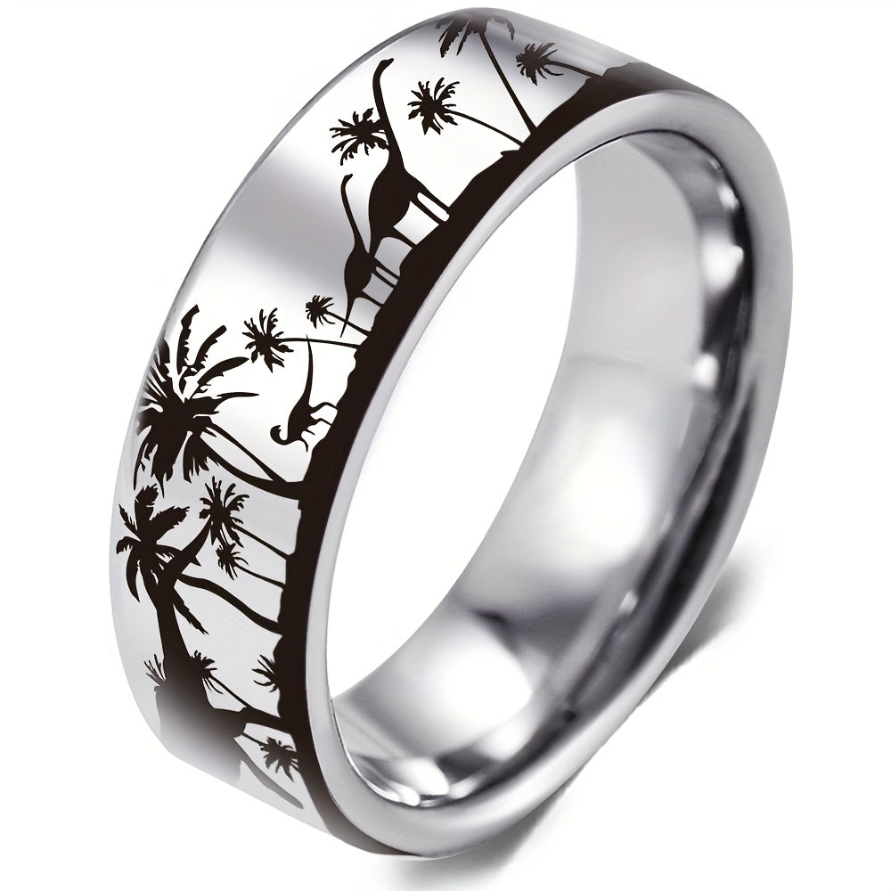 This unique men's wedding ring features a dinosaur and palm tree design. Made of stainless steel, it is suitable for all season wear with an animal theme.