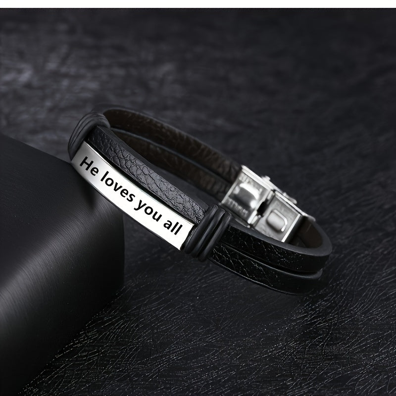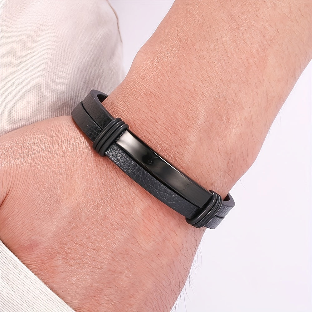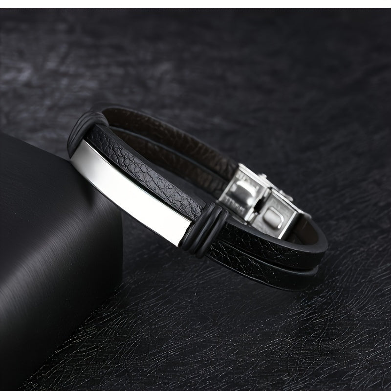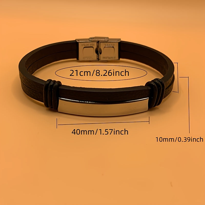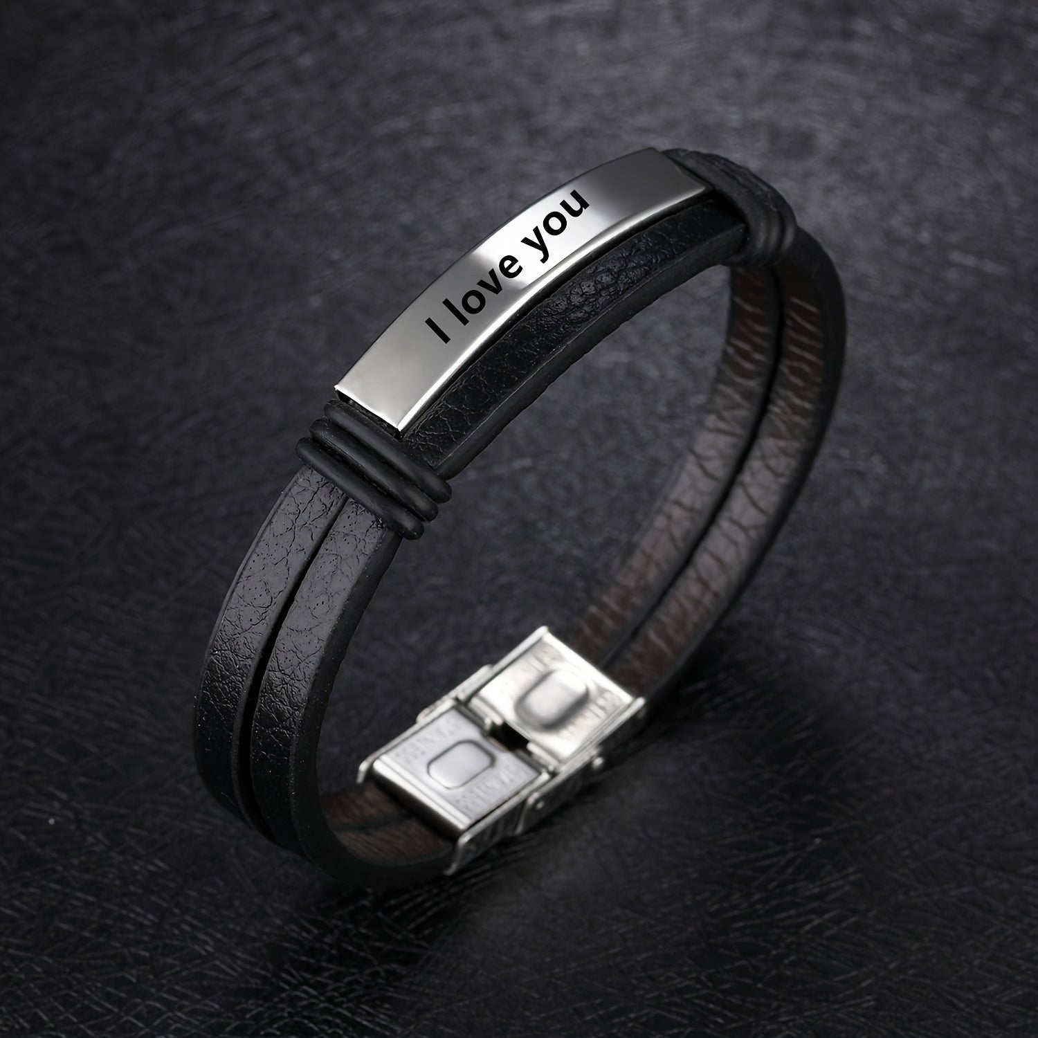 Elevate your style with this Men's Bracelet featuring double faux leather straps and durable stainless steel. Customizable text up to 15 characters per line. Perfect for the holiday season.