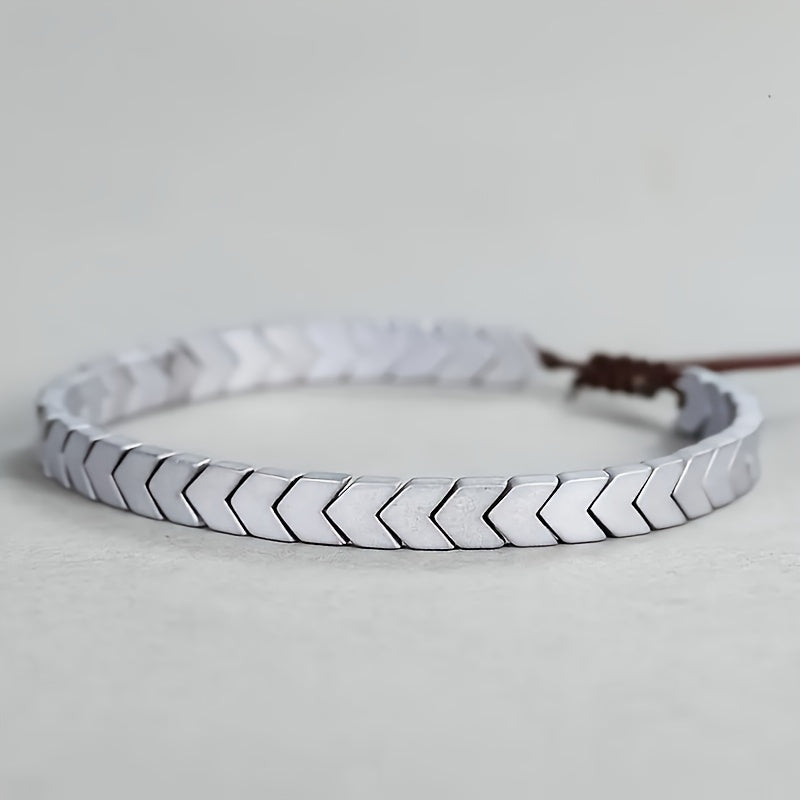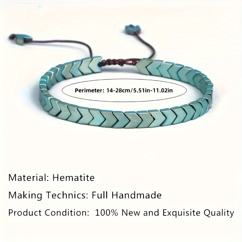 This stylish men's bracelet features natural hematite stones with a green gradient color on a braided cord. Perfect for adding a touch of sophistication to any outfit.