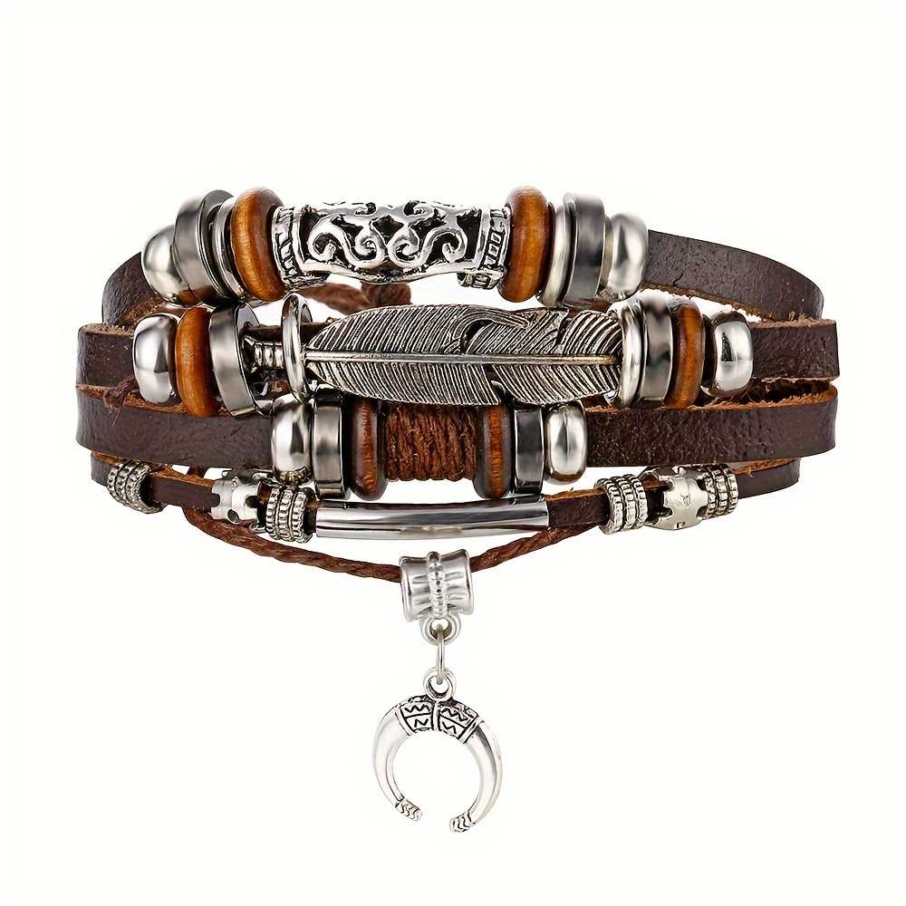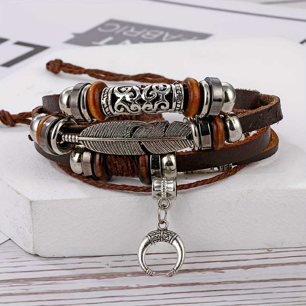 Men's Silver Multi Layer Braided Brown Leather Feather Moon Bead Bracelet