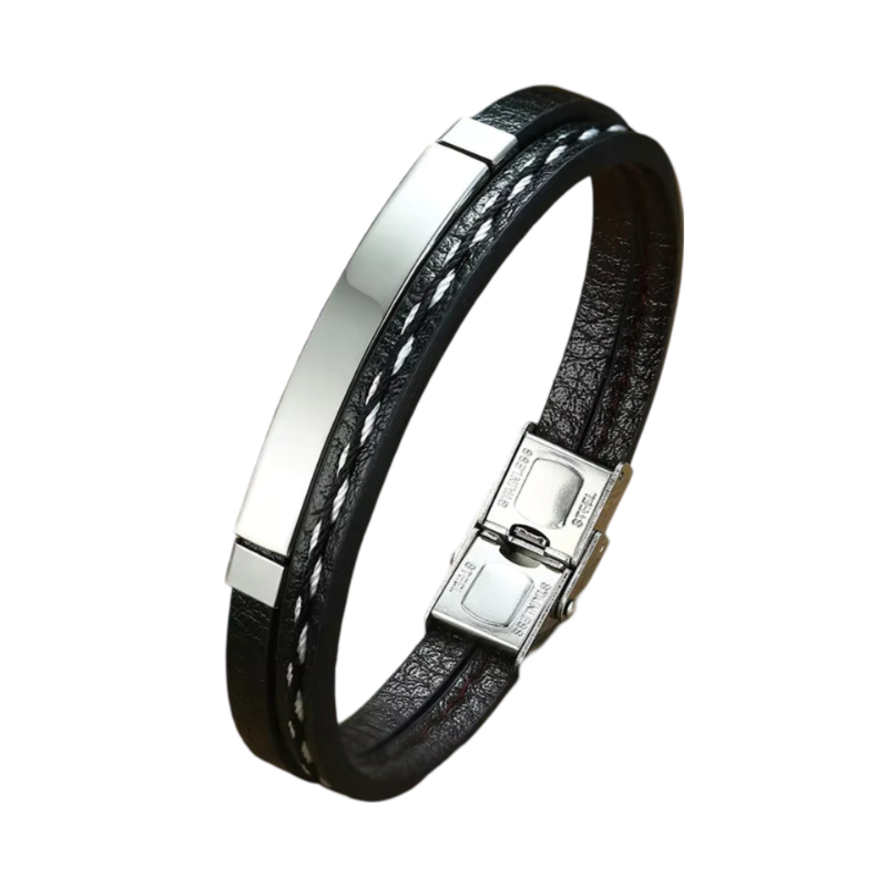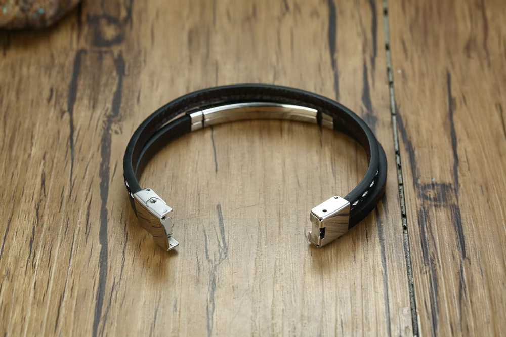 Men's Stainless Steel Rectangle Layer Black Leather Slot Design Bracelet