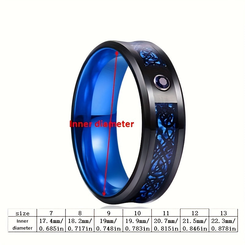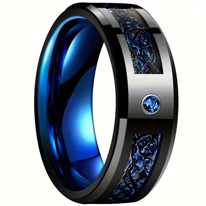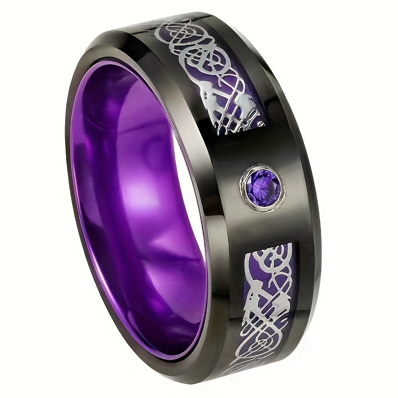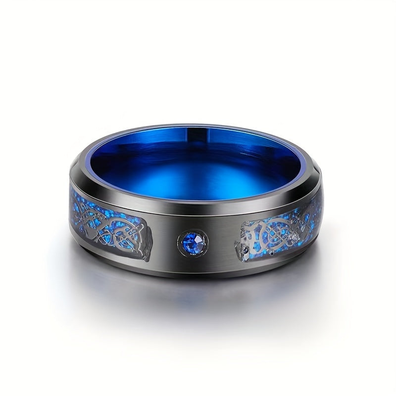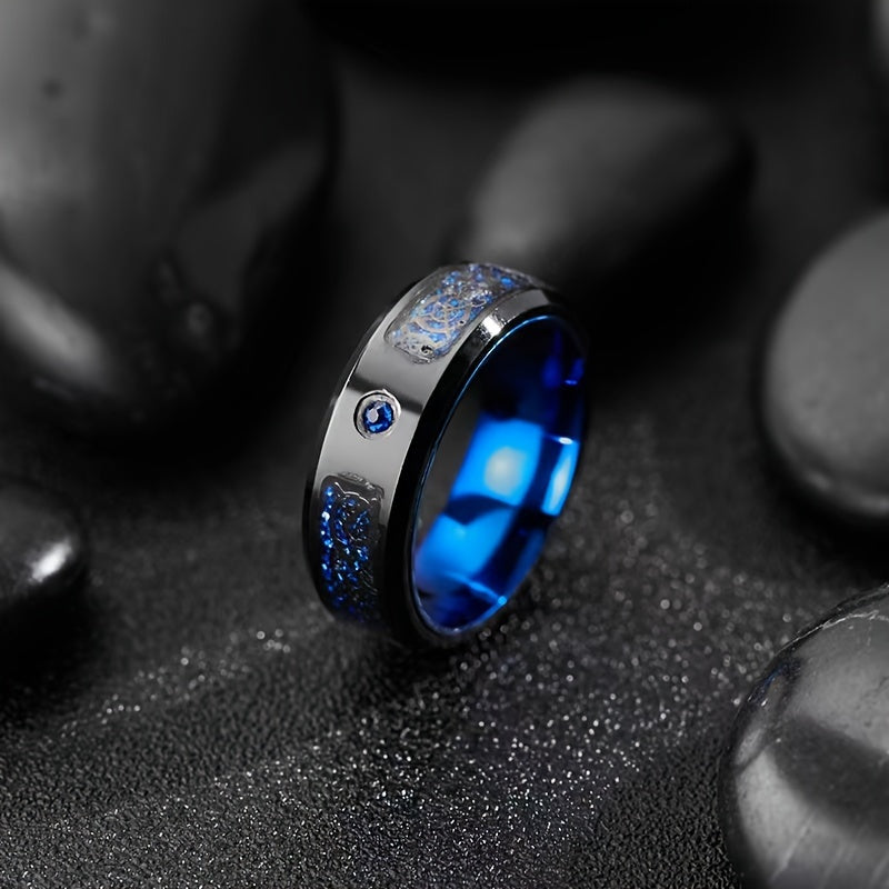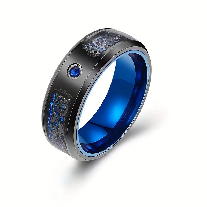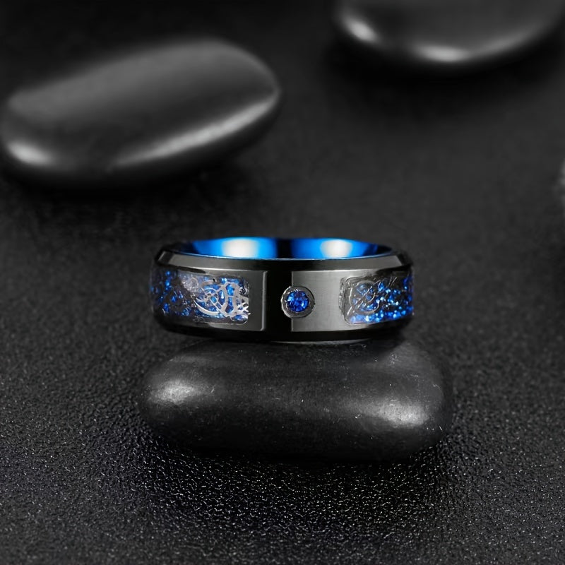 This unique ring features a dragon design with a plastic setting on a durable titanium steel body.