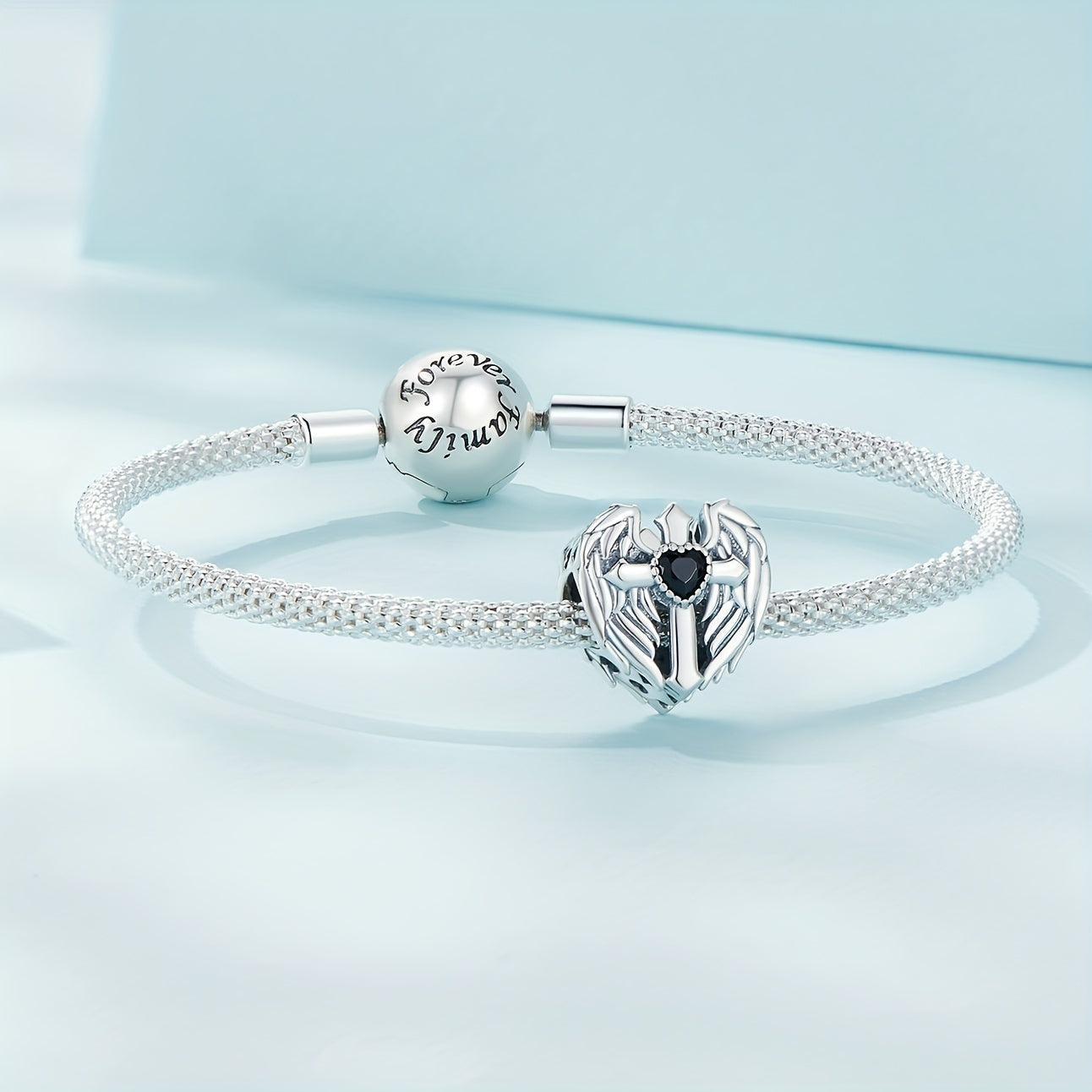PANPOKI 925 Silver Wings Cross Heart Pendant Women Bracelet Bangle DIY Jewelry