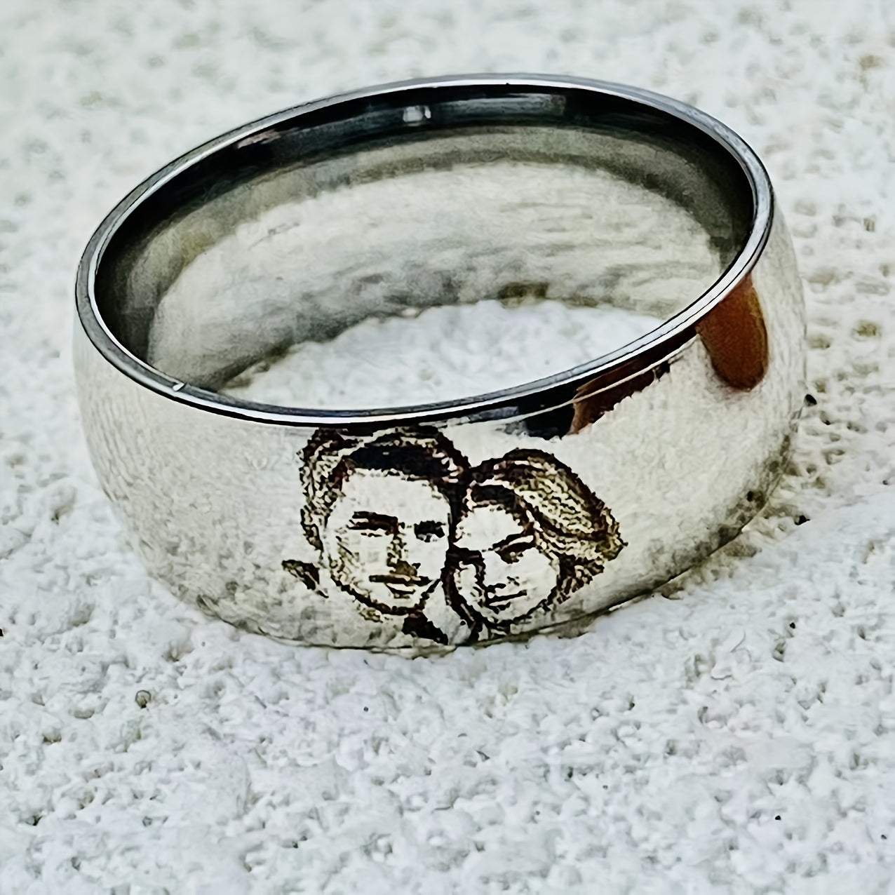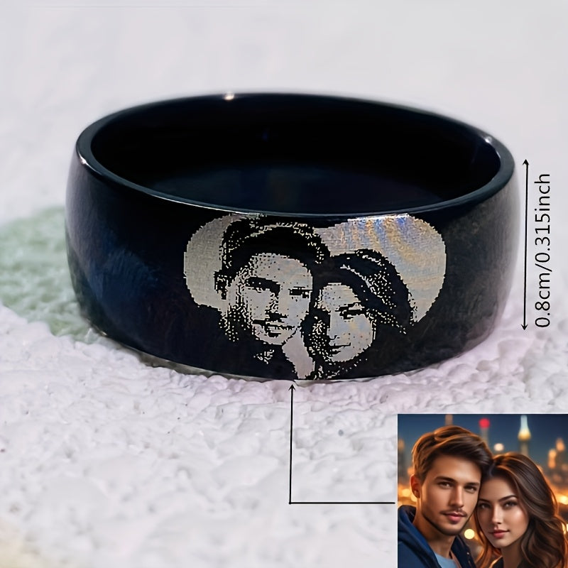 Custom photo engraved ring made of polished stainless steel, perfect for birthdays and graduations.