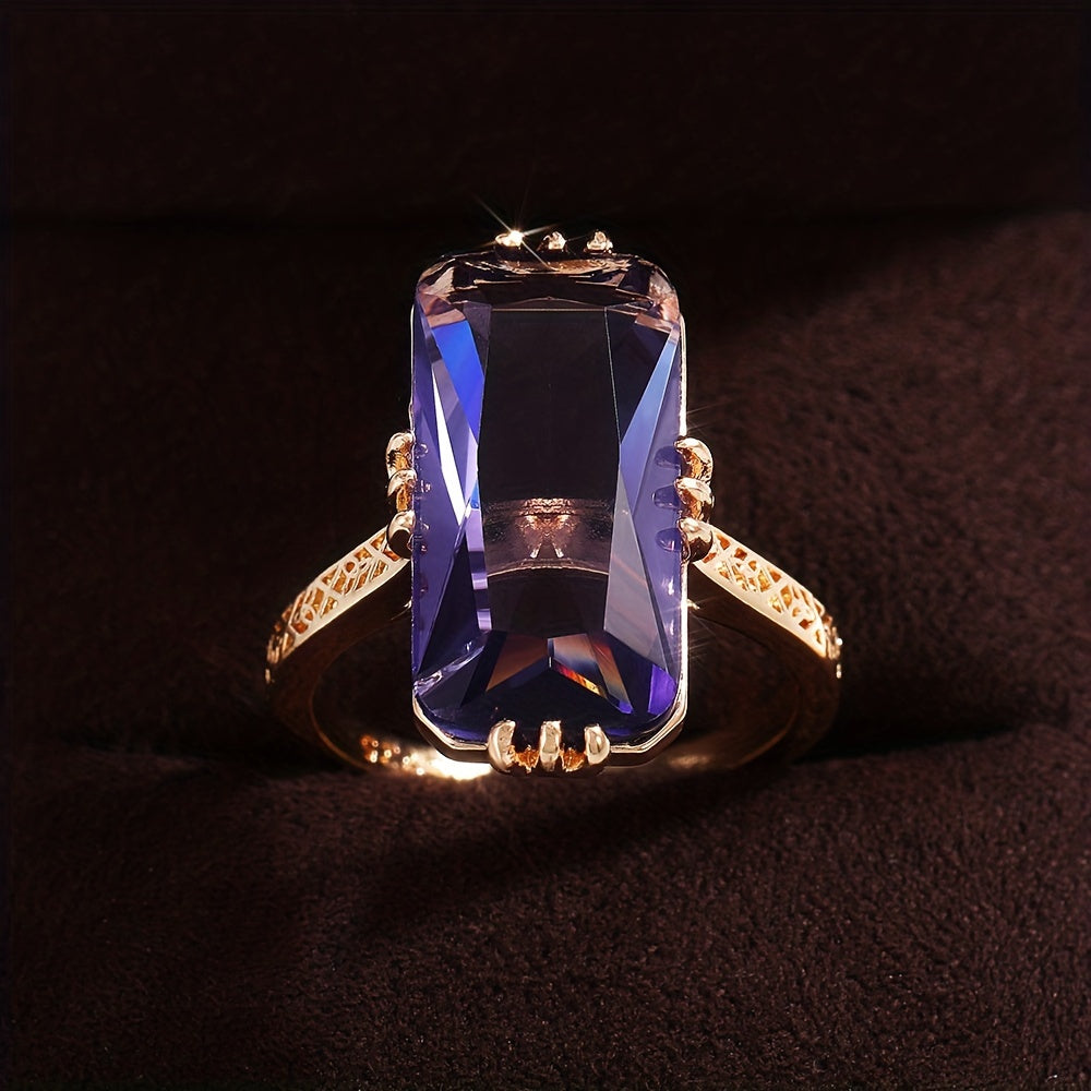 This stunning ring features a purple gradient geometric design on golden tone metal, perfect for weddings, engagements, and parties.