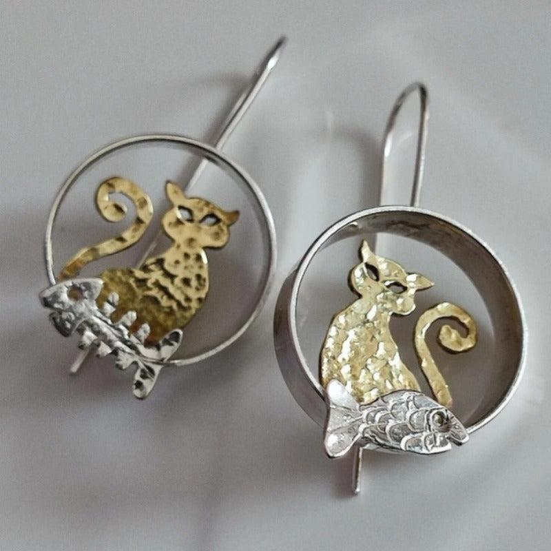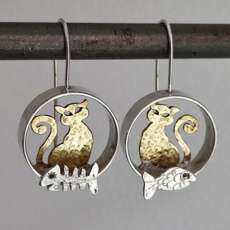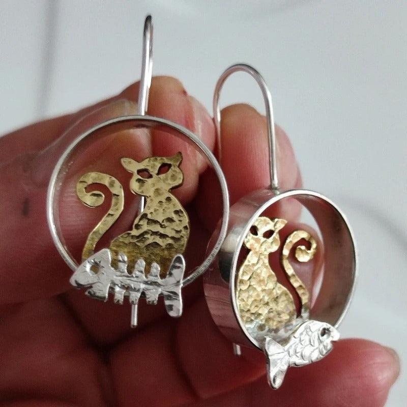 Retro Bohemian Cat & Fish Pendant Earrings KC Golden Plated Copper Jewelry
