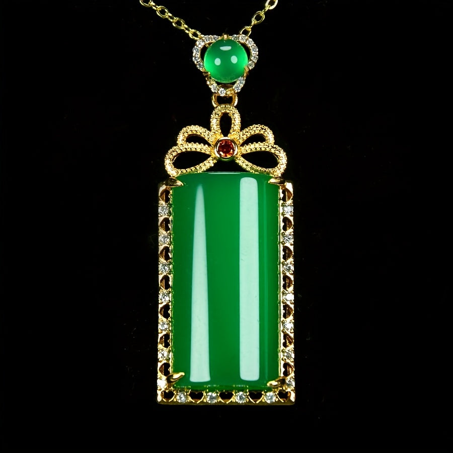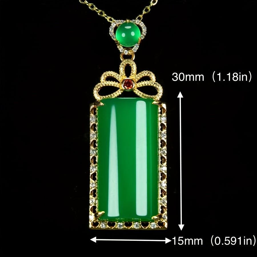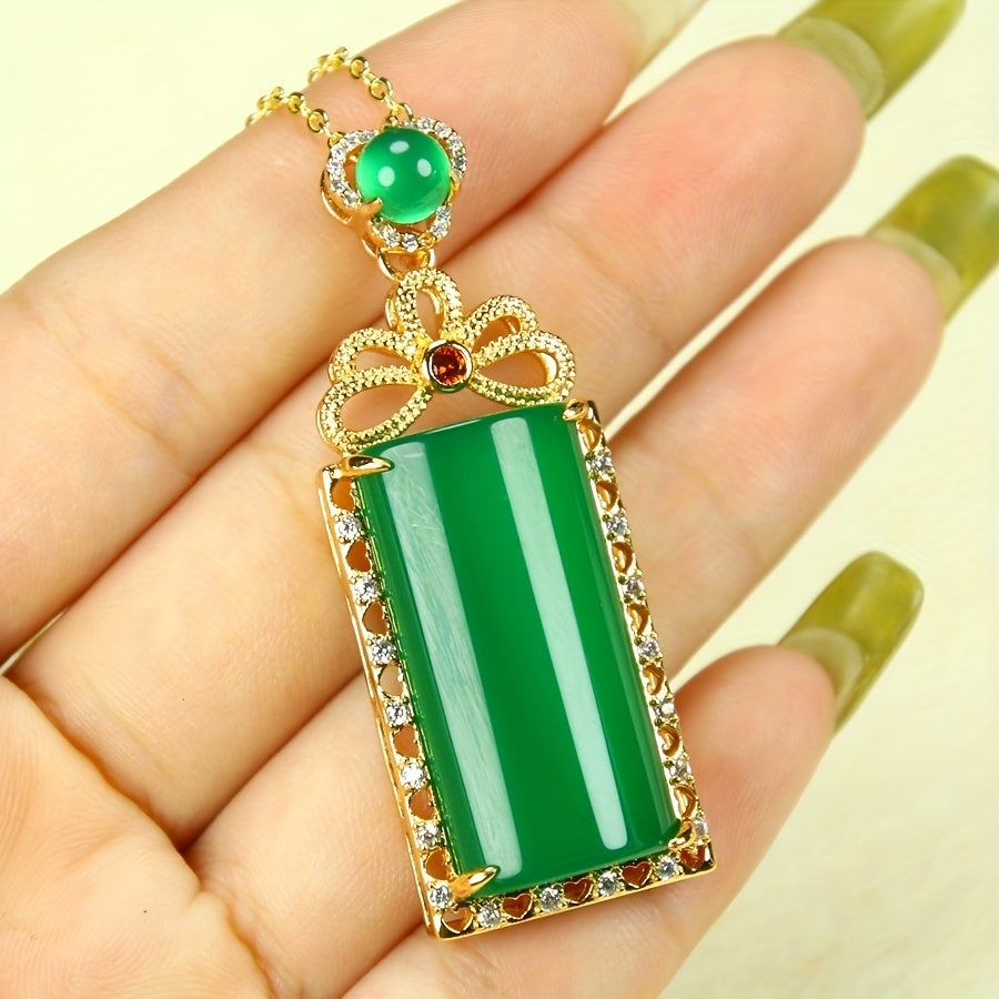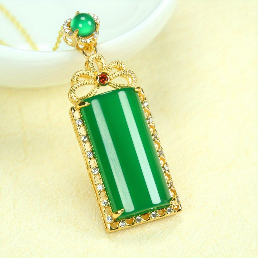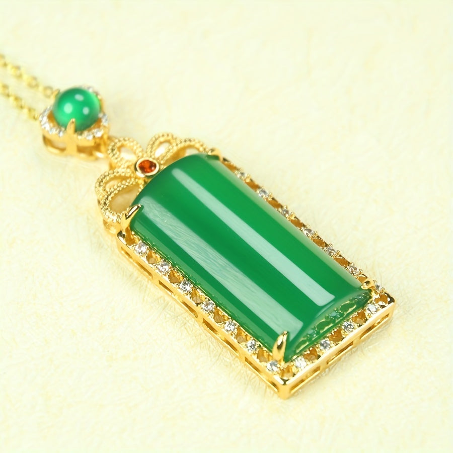Elevate your style with this fashionable pendant necklace featuring a green agate semi cylinder shape adorned with rhinestones. Perfect for any occasion.