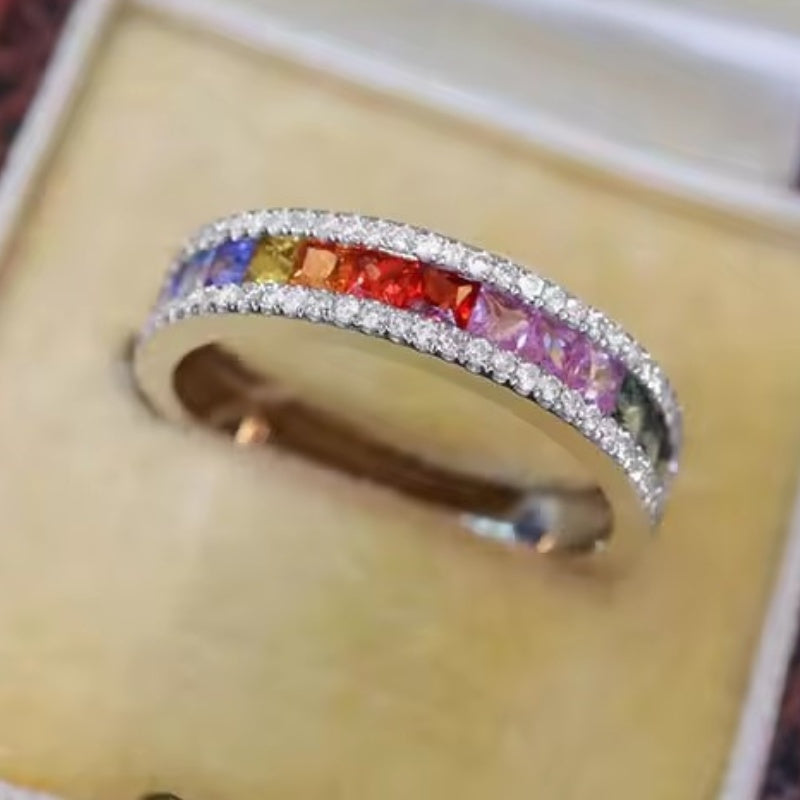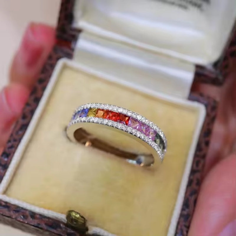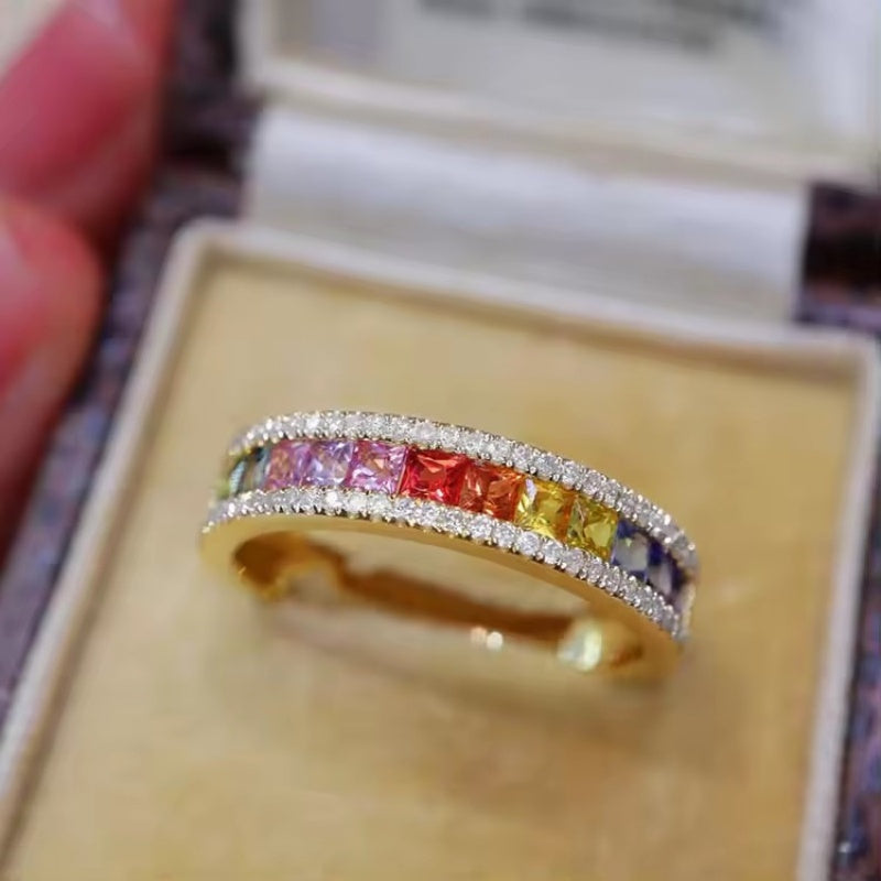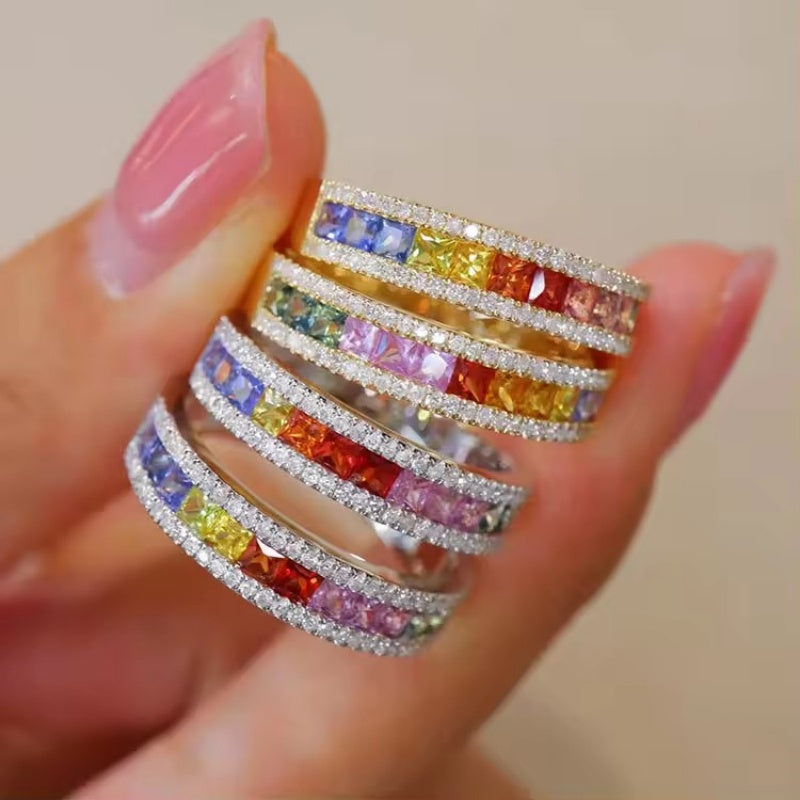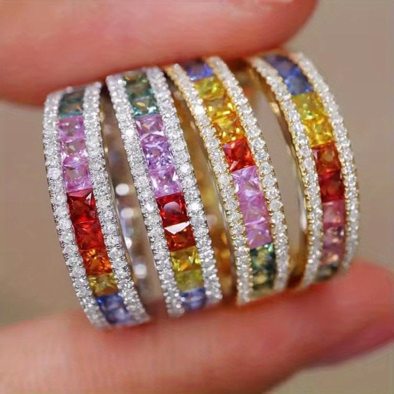 Add a pop of color to your outfit with this rainbow gradient gemstone ring. Ideal for casual attire or parties, this ring is made of high-quality copper with a golden finish.