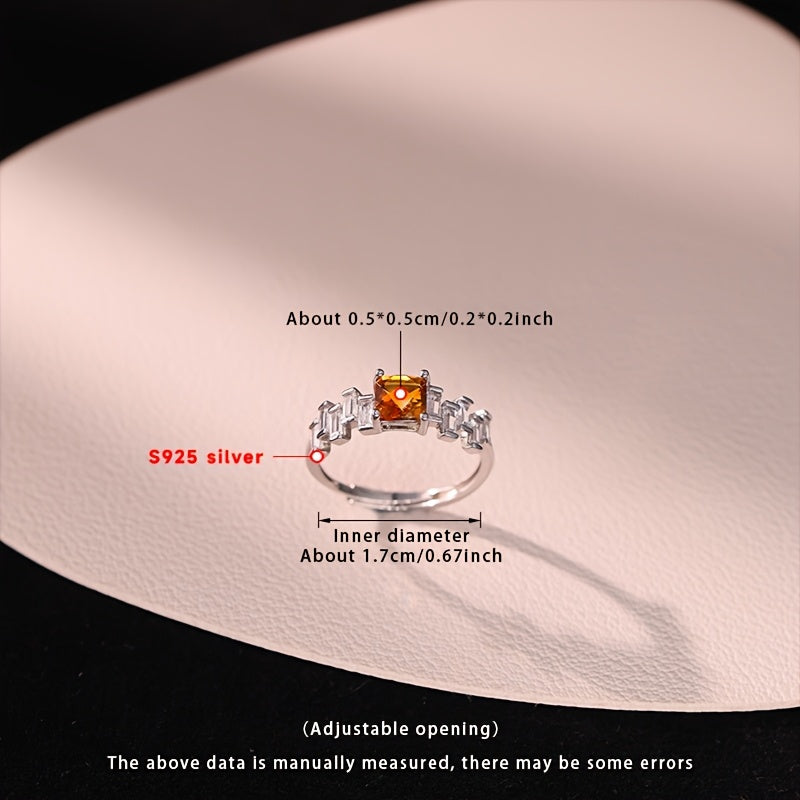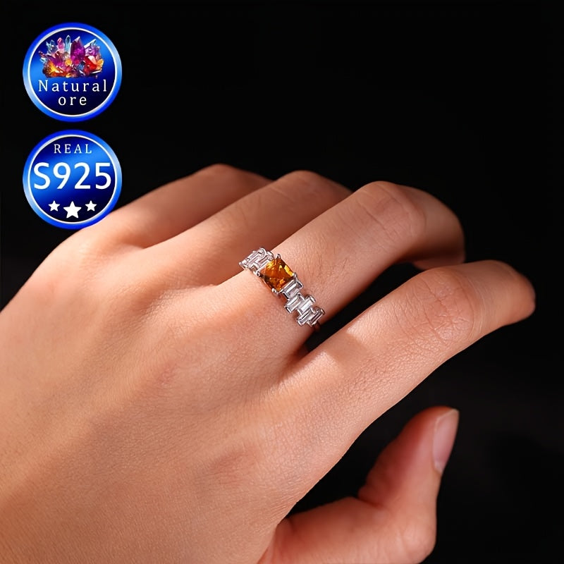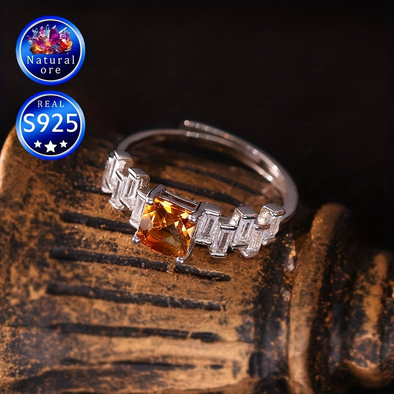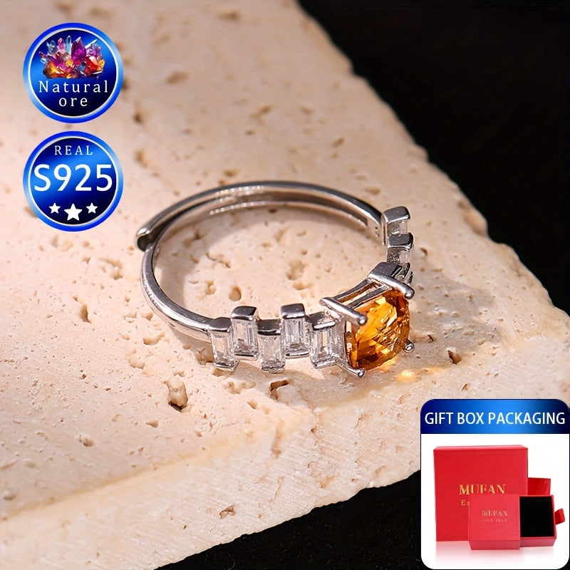 This adjustable open ring features a natural yellow gemstone set in S925 silver, perfect for daily wear or as a wedding accessory. It comes in a gift box, making it an ideal bridesmaid gift or present.