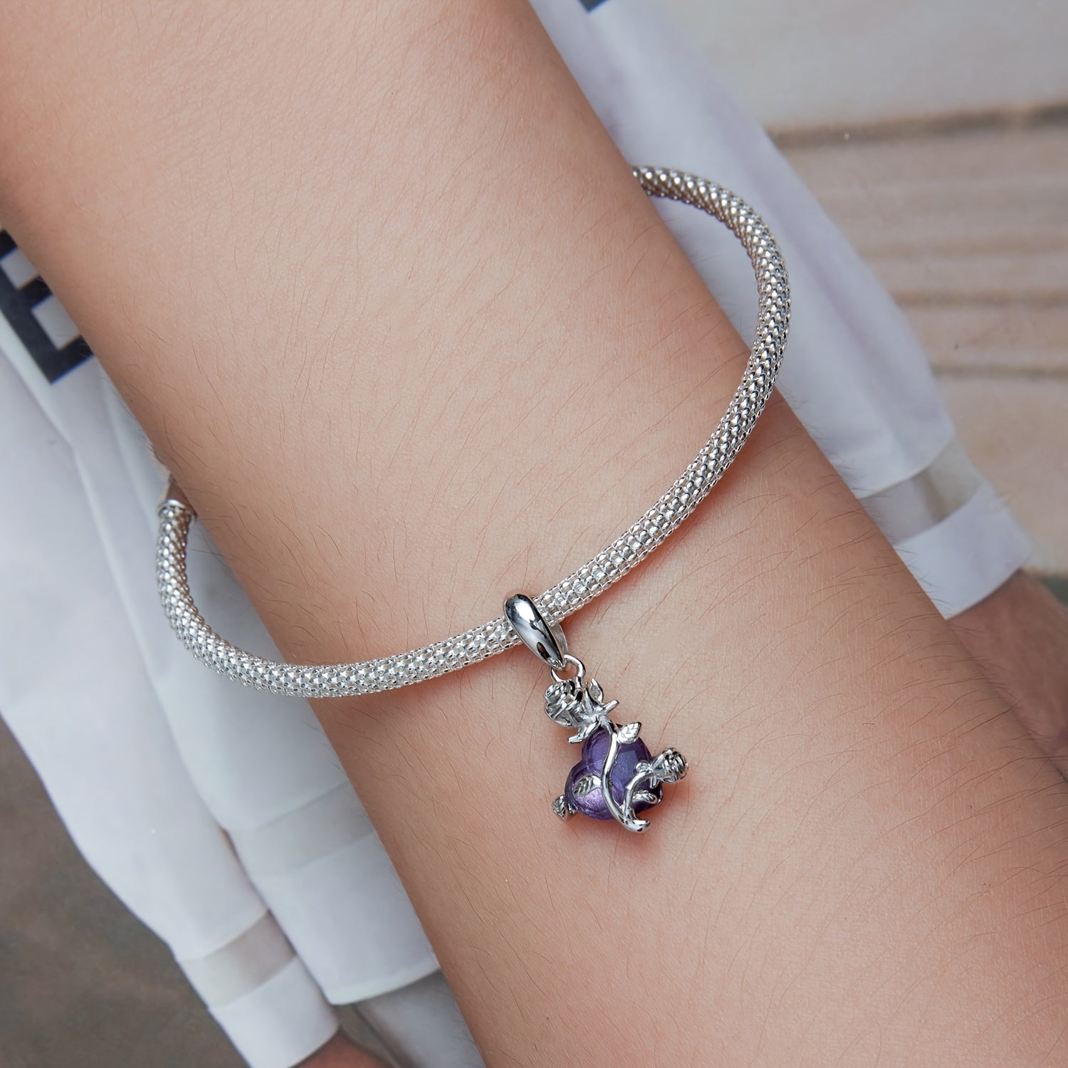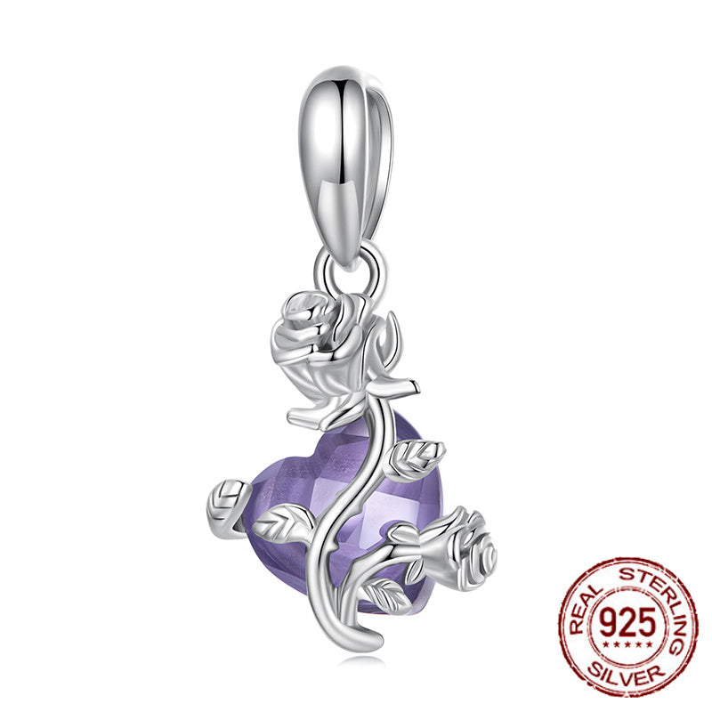 S925 Sterling Silver Rose Bead Bracelet with Purple Heart Zircon Pendant