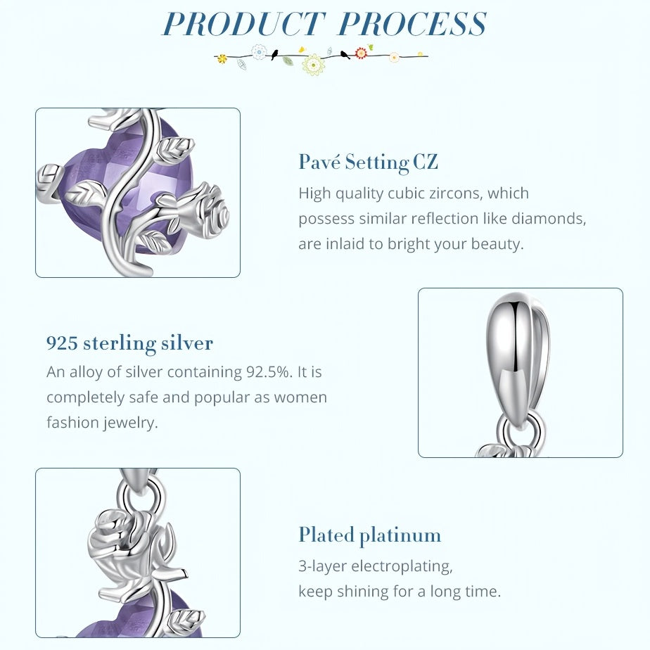 This stunning bracelet features a delicate rose bead design made of S925 sterling silver. It is elegantly crafted with a heart-shaped purple zircon pendant, adding a touch of glamour to your ensemble.