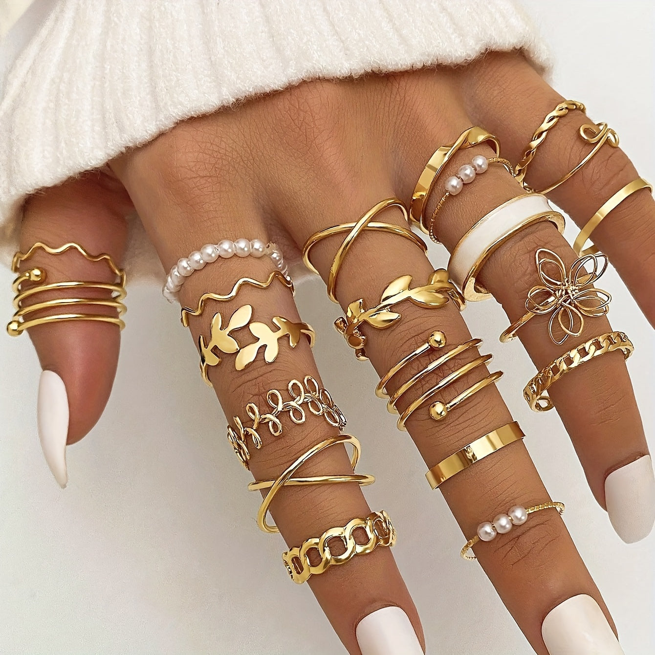 Elevate your vacation look with this set of 21 stylish and minimalist rings. Each ring features unique elements such as crosses, suns, moons, eyes, and leaves, adding a touch of elegance to your outfit.