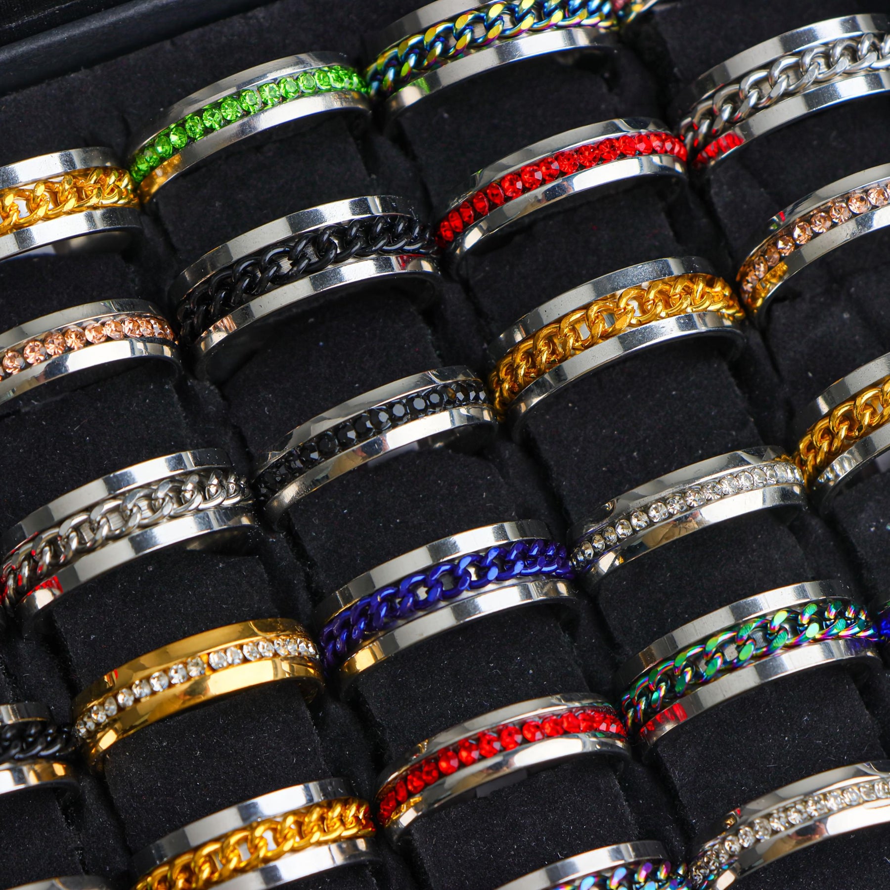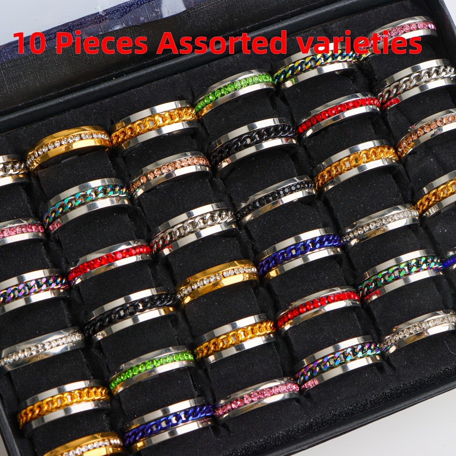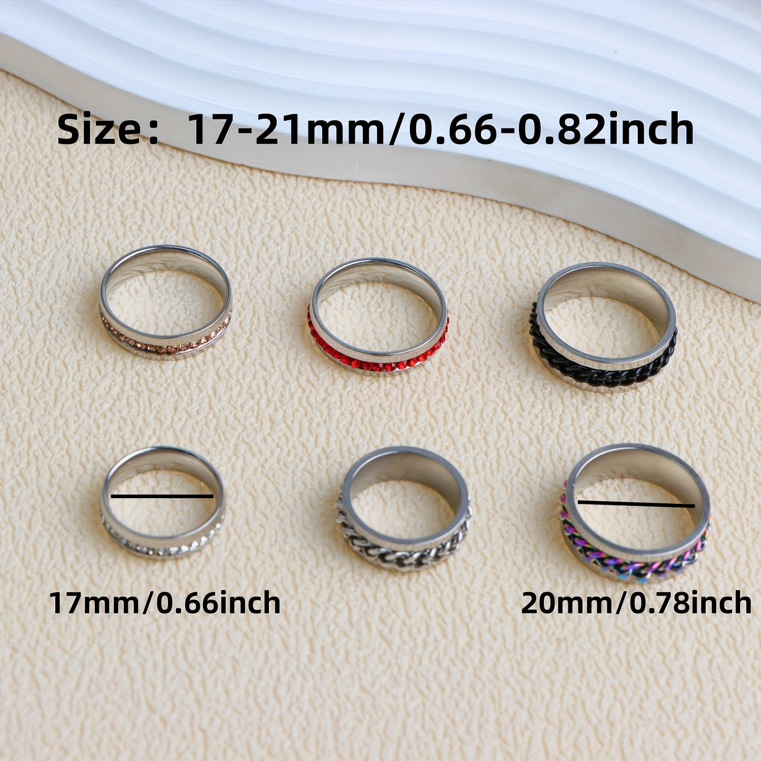 This pack includes 10-20 minimalist stainless steel rotating rings with rhinestone chains. Perfect for men and women to wear daily or at parties. A great gift option for someone who loves minimalist jewelry.