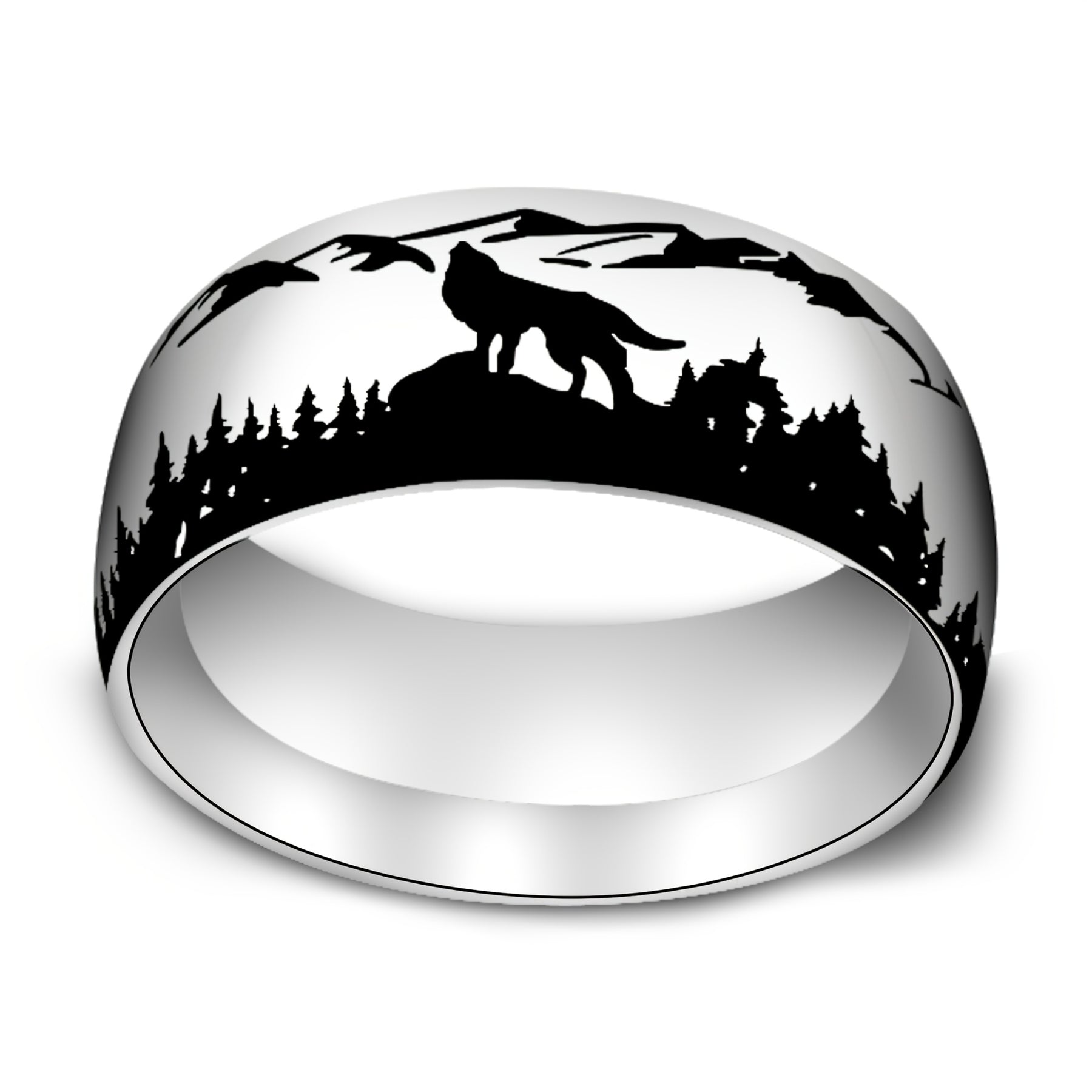 This stainless steel ring features a howling wolf and forest design, suitable for all seasons. It adds a sleek and casual touch to your outfit and is perfect for parties.