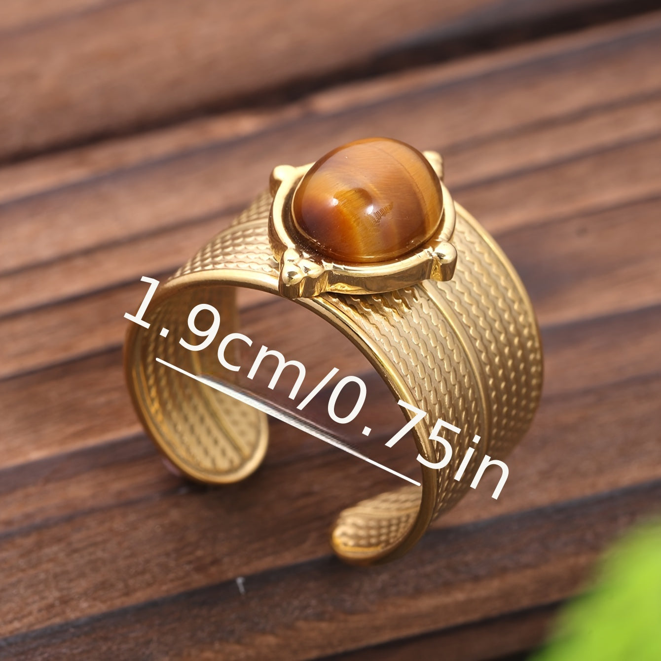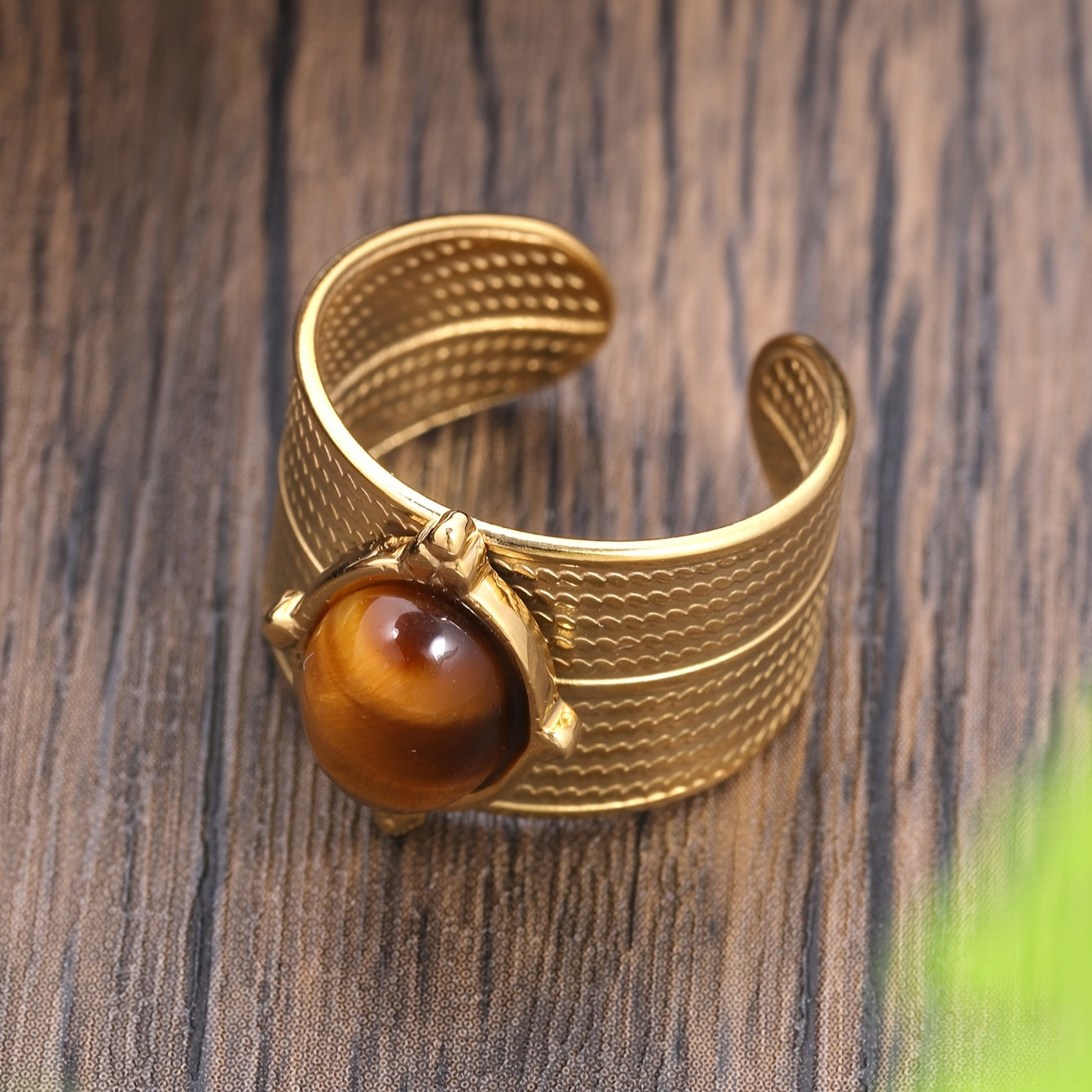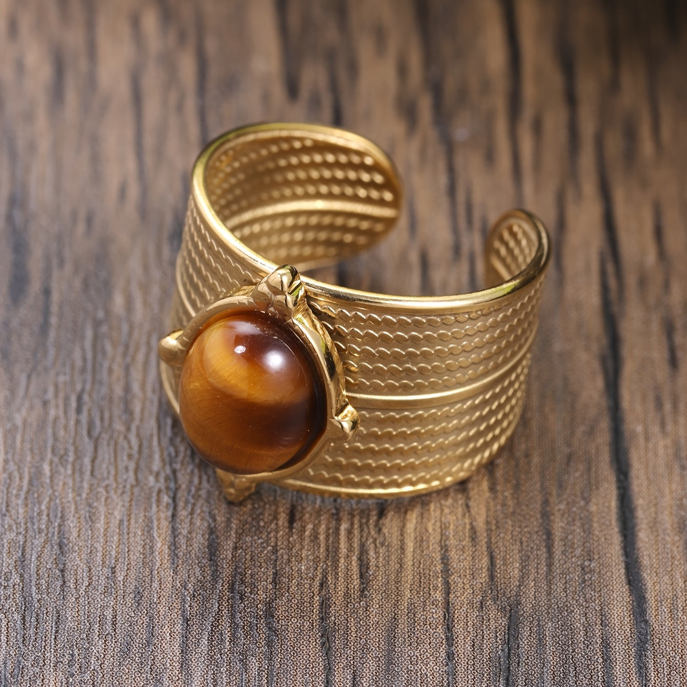 This vintage inspired stainless steel ring features an oval coffee colored stone, making it perfect for daily wear or special occasions. The open band is adjustable for a comfortable fit. An ideal gift for her.