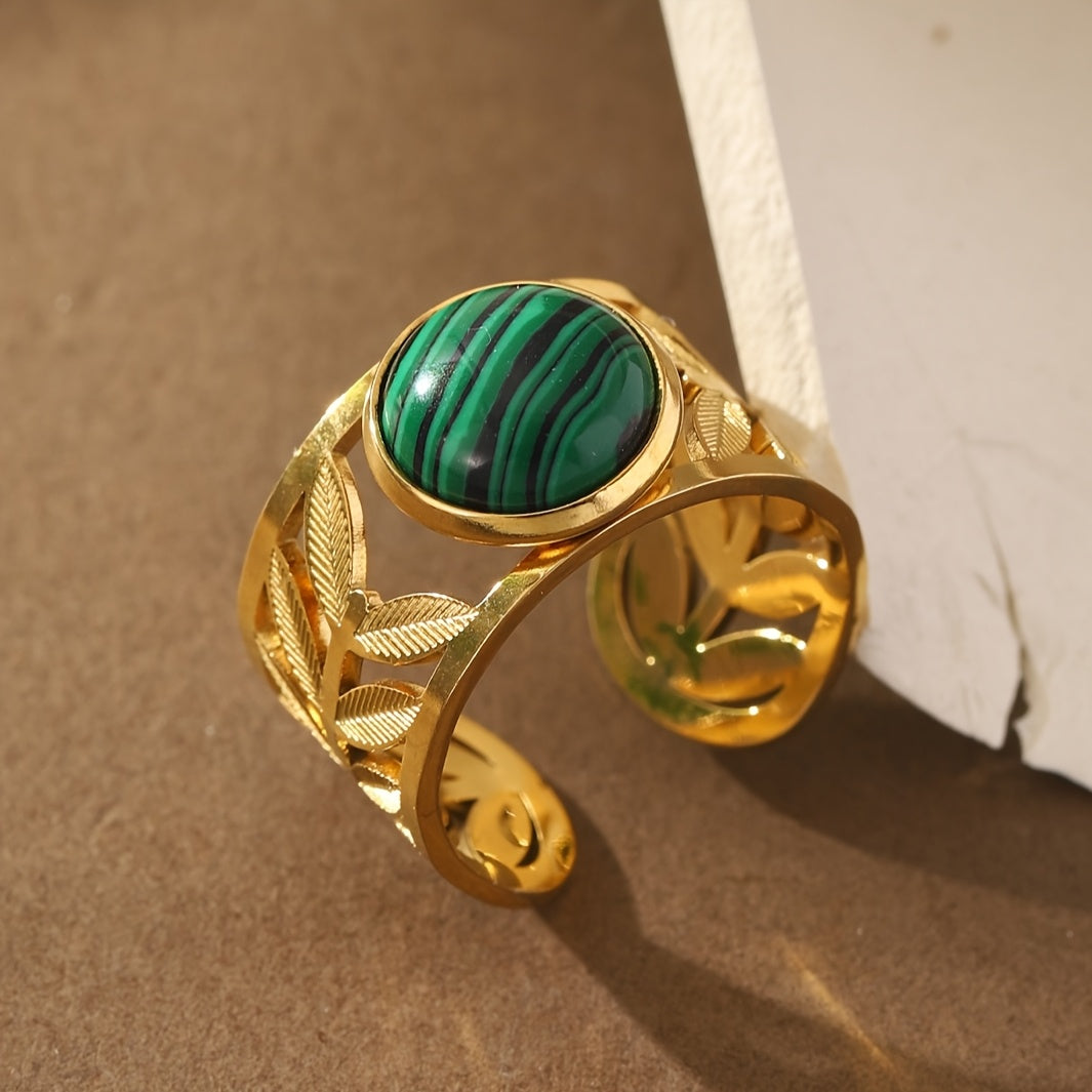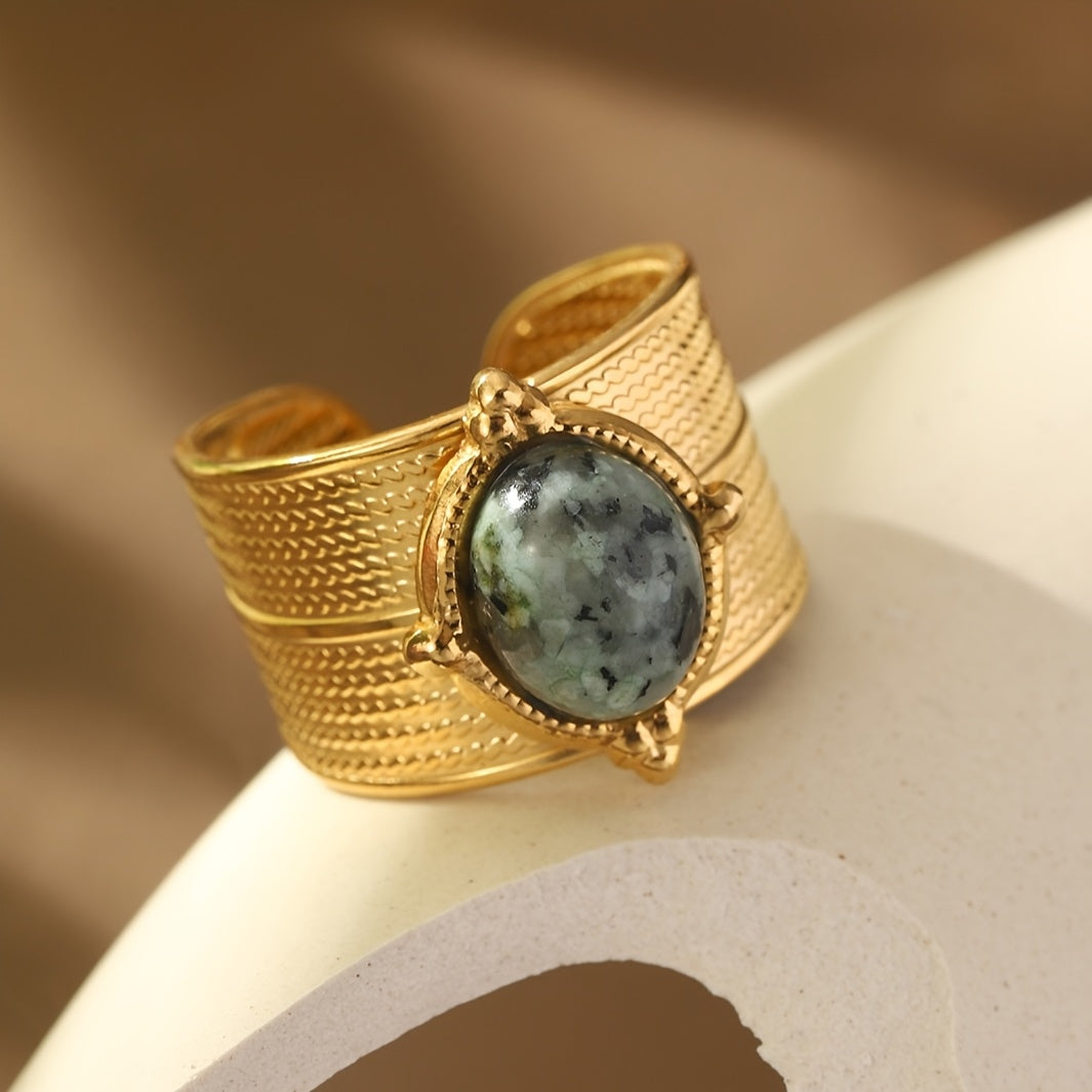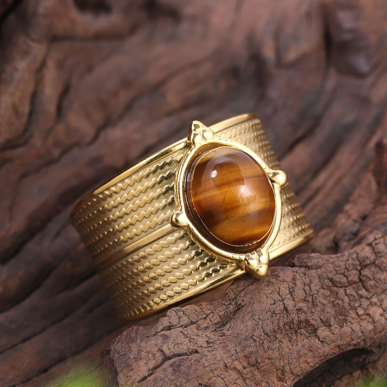 This vintage inspired stainless steel ring features an oval coffee colored stone, making it perfect for daily wear or special occasions. The open band is adjustable for a comfortable fit. An ideal gift for her.