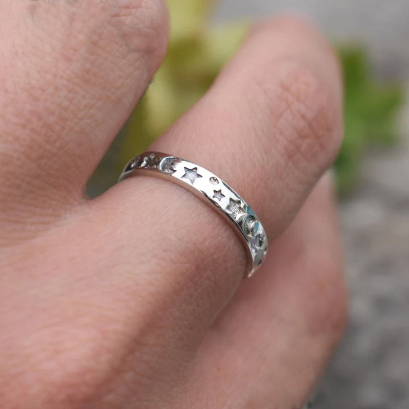 This stainless steel ring features a beautiful design of moons and stars, perfect for stacking or wearing alone. It makes a great gift for any occasion.