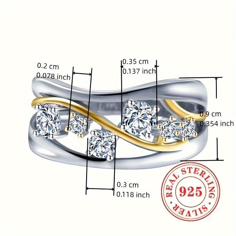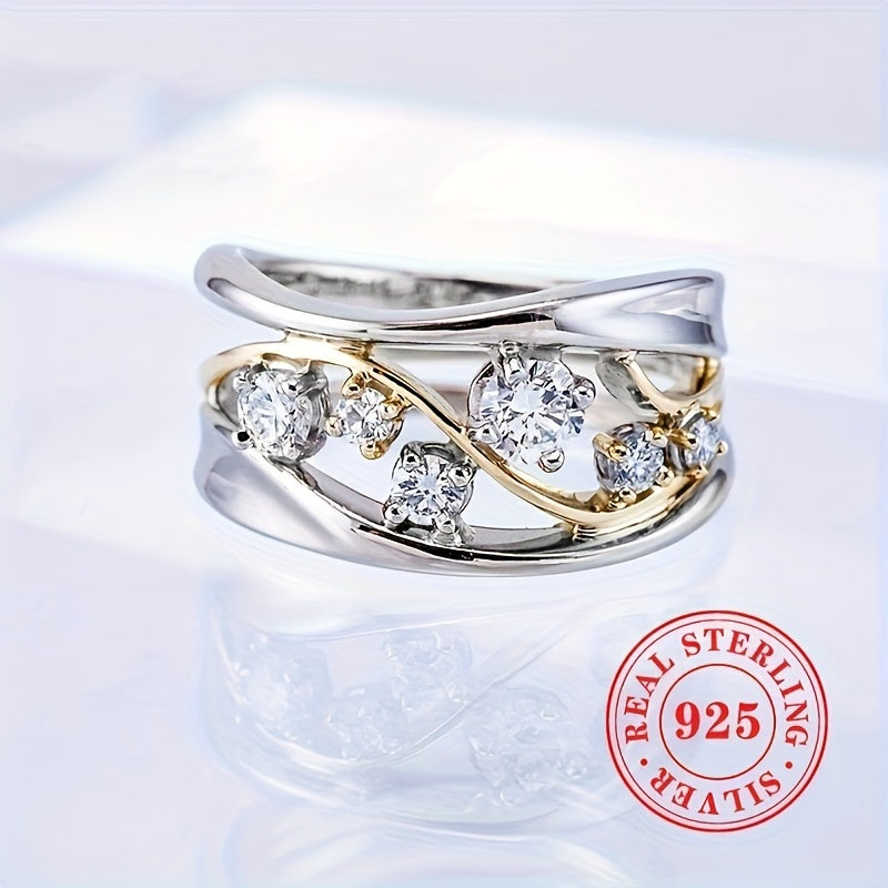 Elegant wide band ring made from high-quality S925 sterling silver with a two-tone design and sparkling zirconia stones.