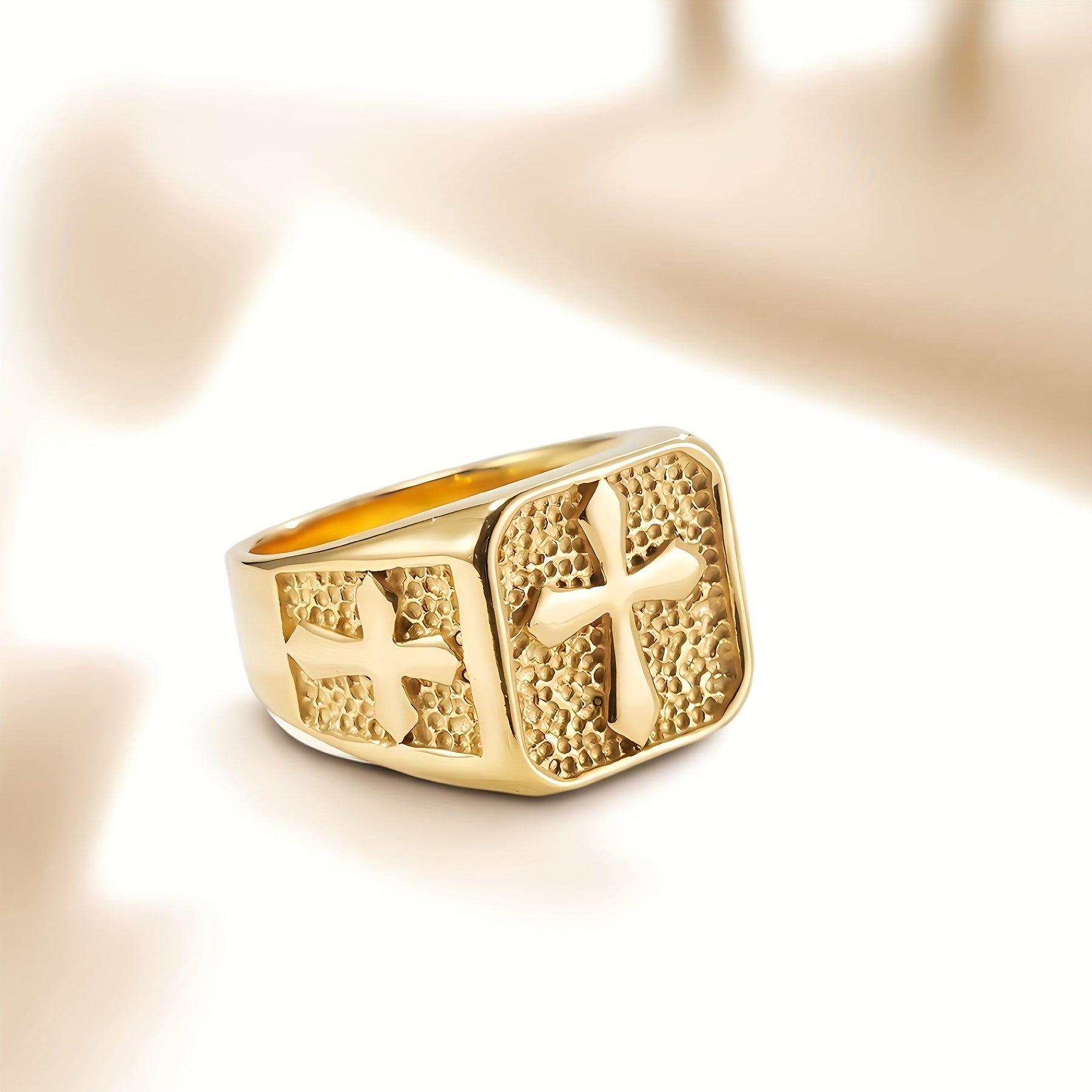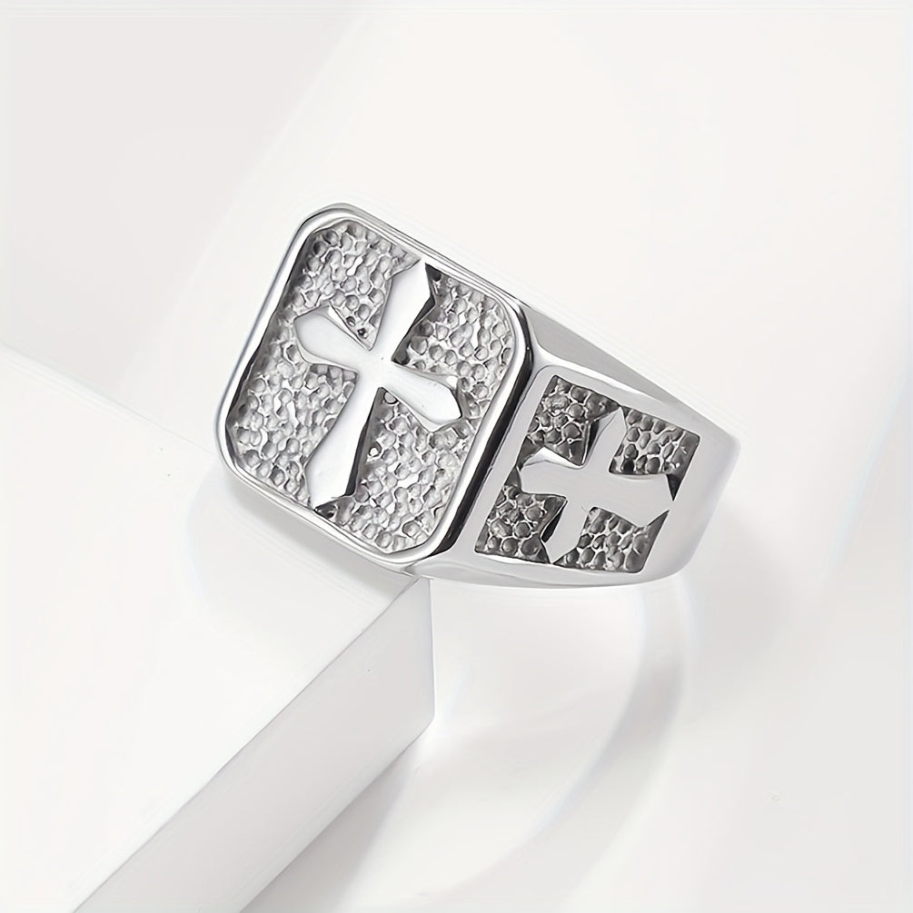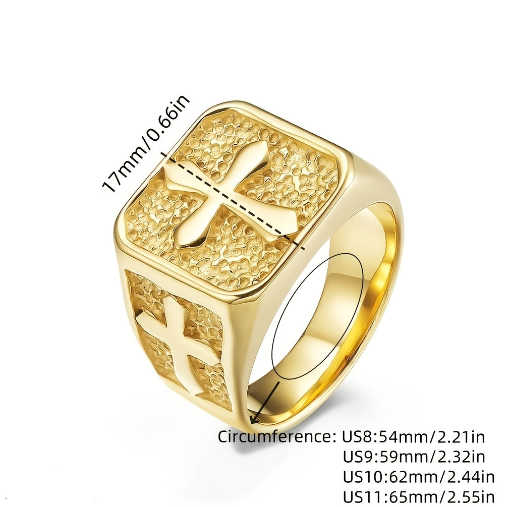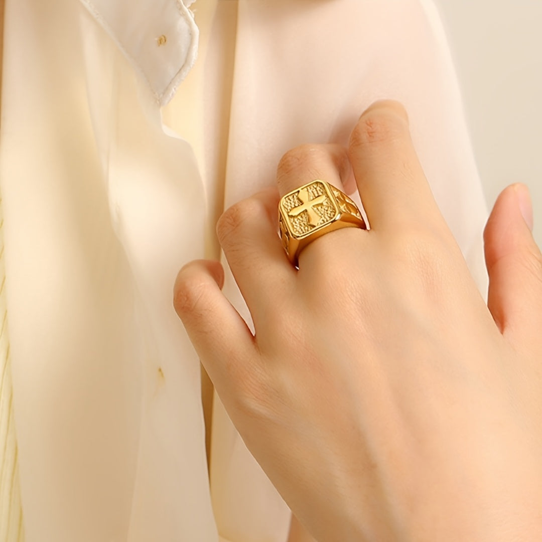 Add a touch of vintage style with this 18K golden plated cross ring. Perfect for making a statement with a classic hip hop look. Unisex design crafted from 316 stainless steel.