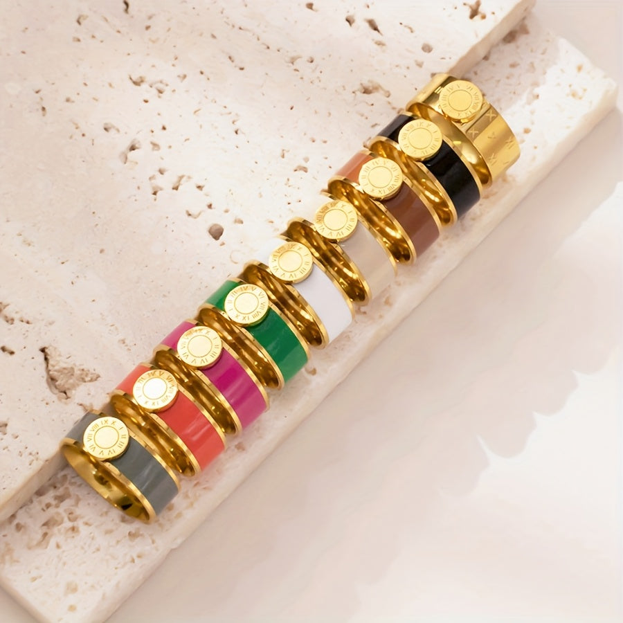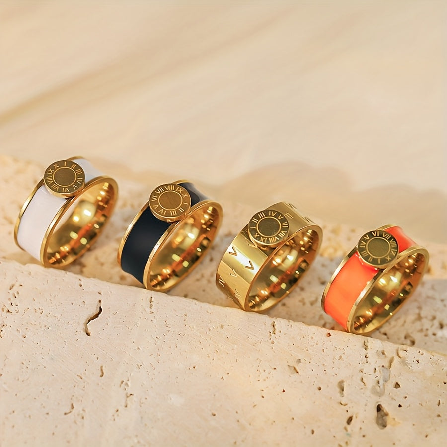This waterproof ring features Roman numerals engraved on 304 stainless steel with enamel drip, making it perfect for casual attire, weddings, and Valentine's jewelry.