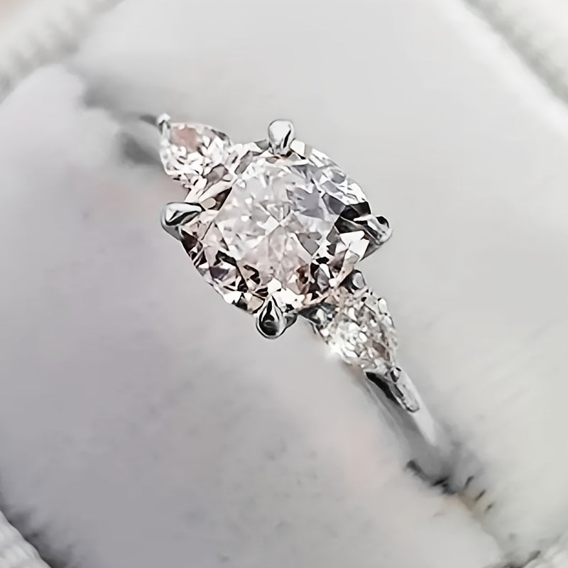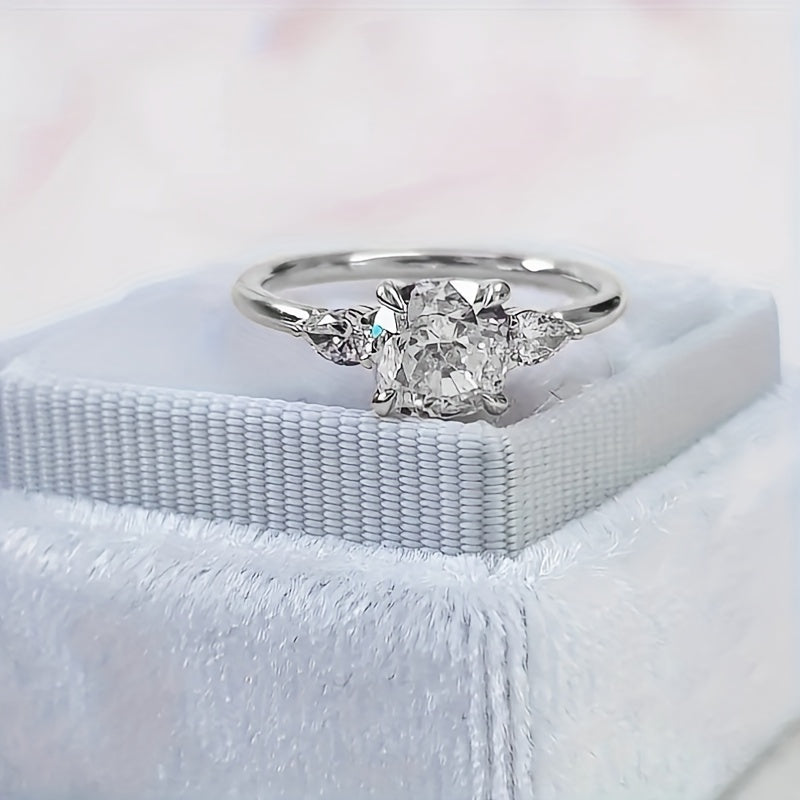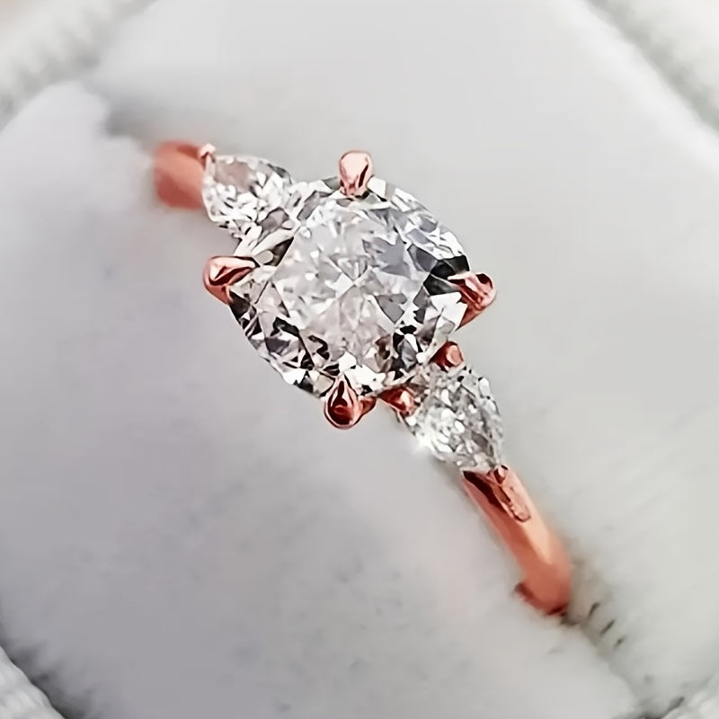 This elegant engagement ring features 3 synthetic cubic zirconia stones set in a golden-plated copper band. Perfect for daily wear and as an April birthstone jewelry option.