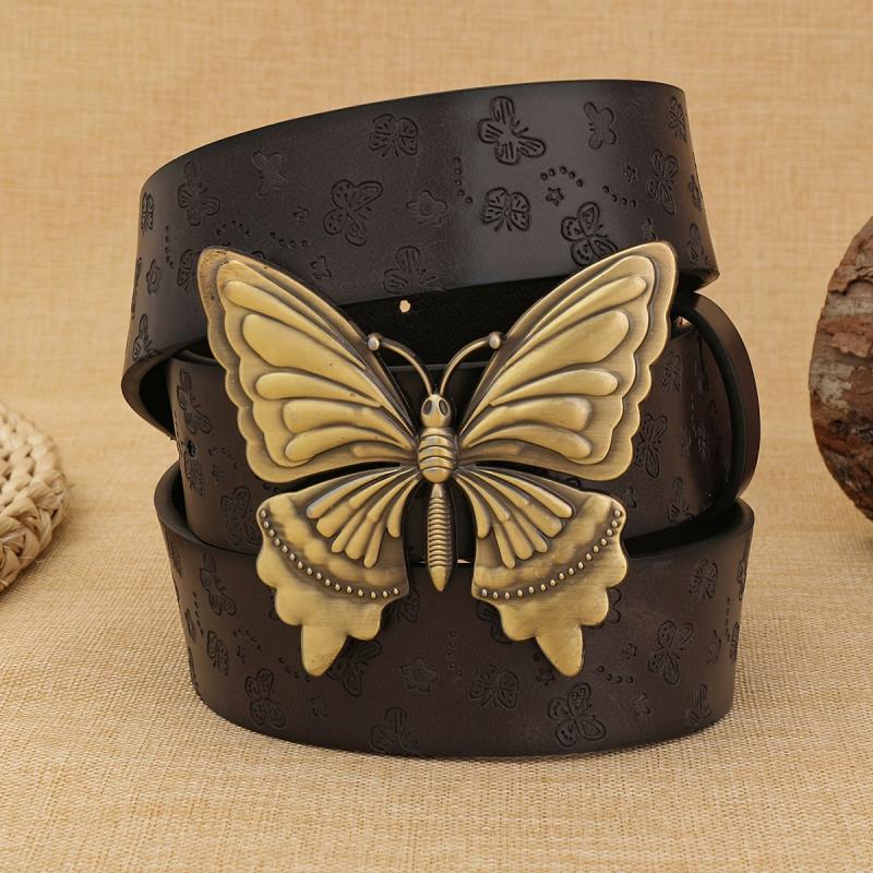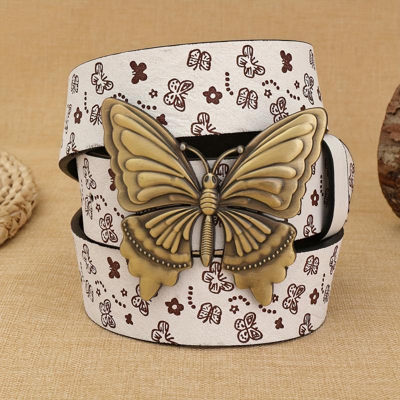 This stylish belt features an embossed butterfly buckle design. Made from PU leather with brown, beige, and leopard print, it is versatile for casual wear, weddings, parties, and more.