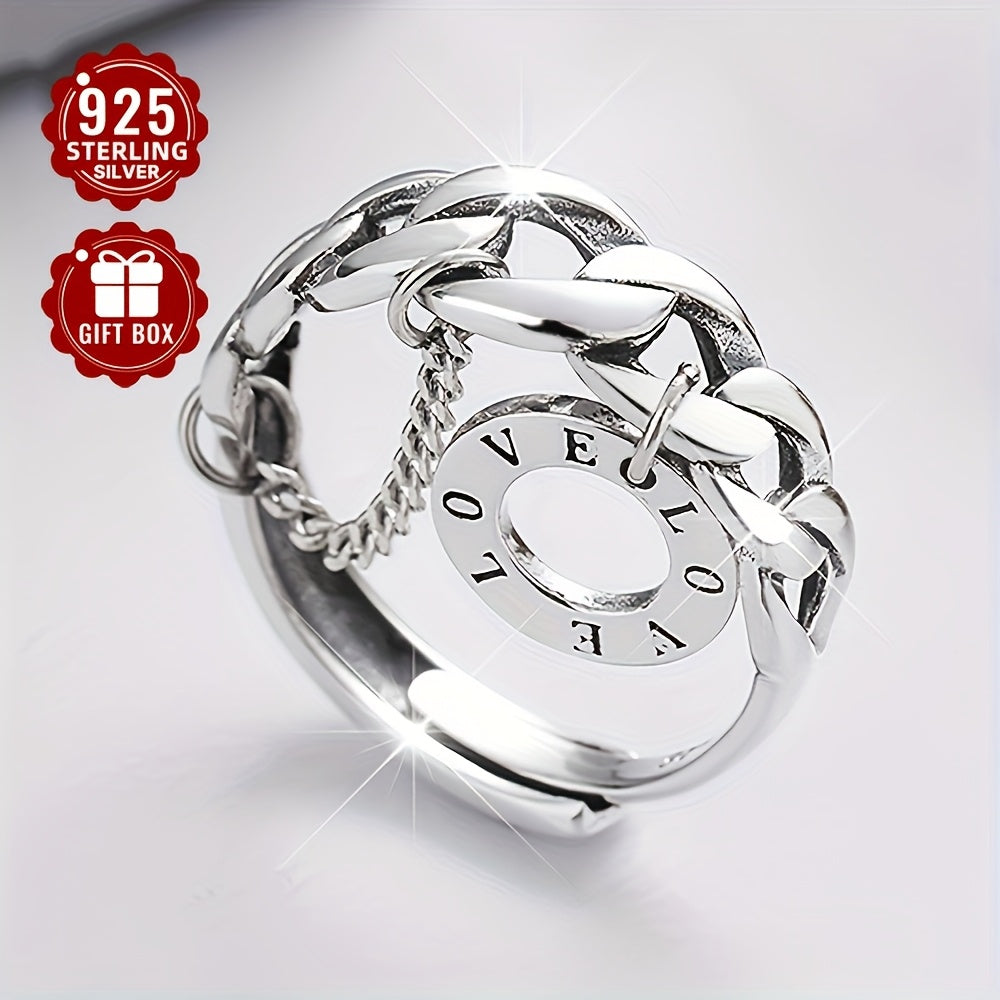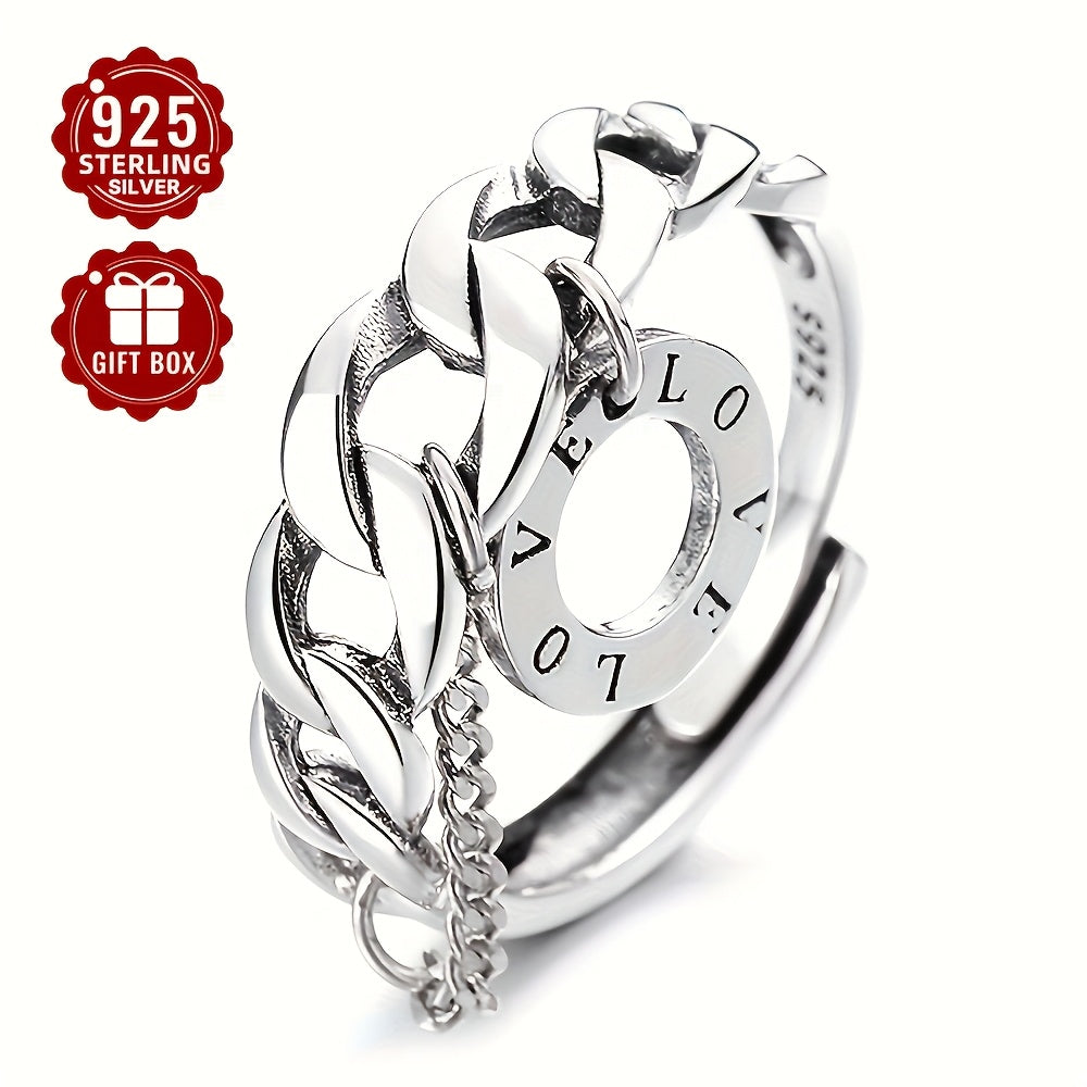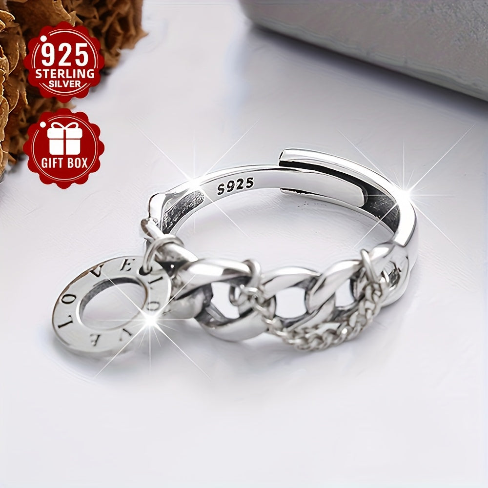 This open ring is made of hypoallergenic S925 sterling silver, featuring a round design with a LOVE chain. It is perfect for daily wear and makes a great gift choice. Embrace a unique and fashionable look with this minimalist ring.