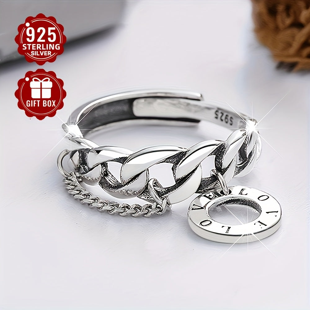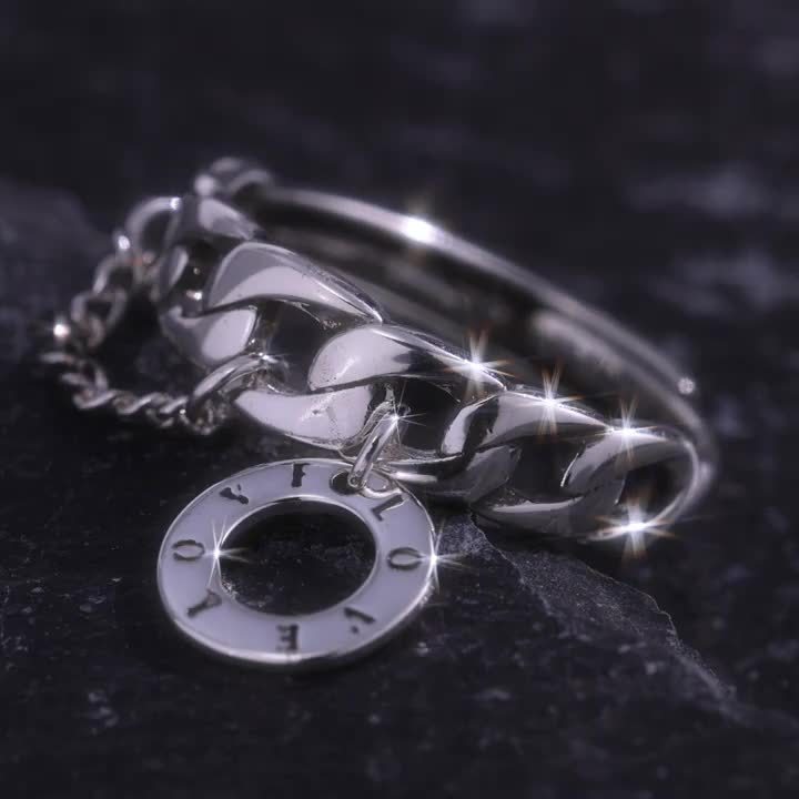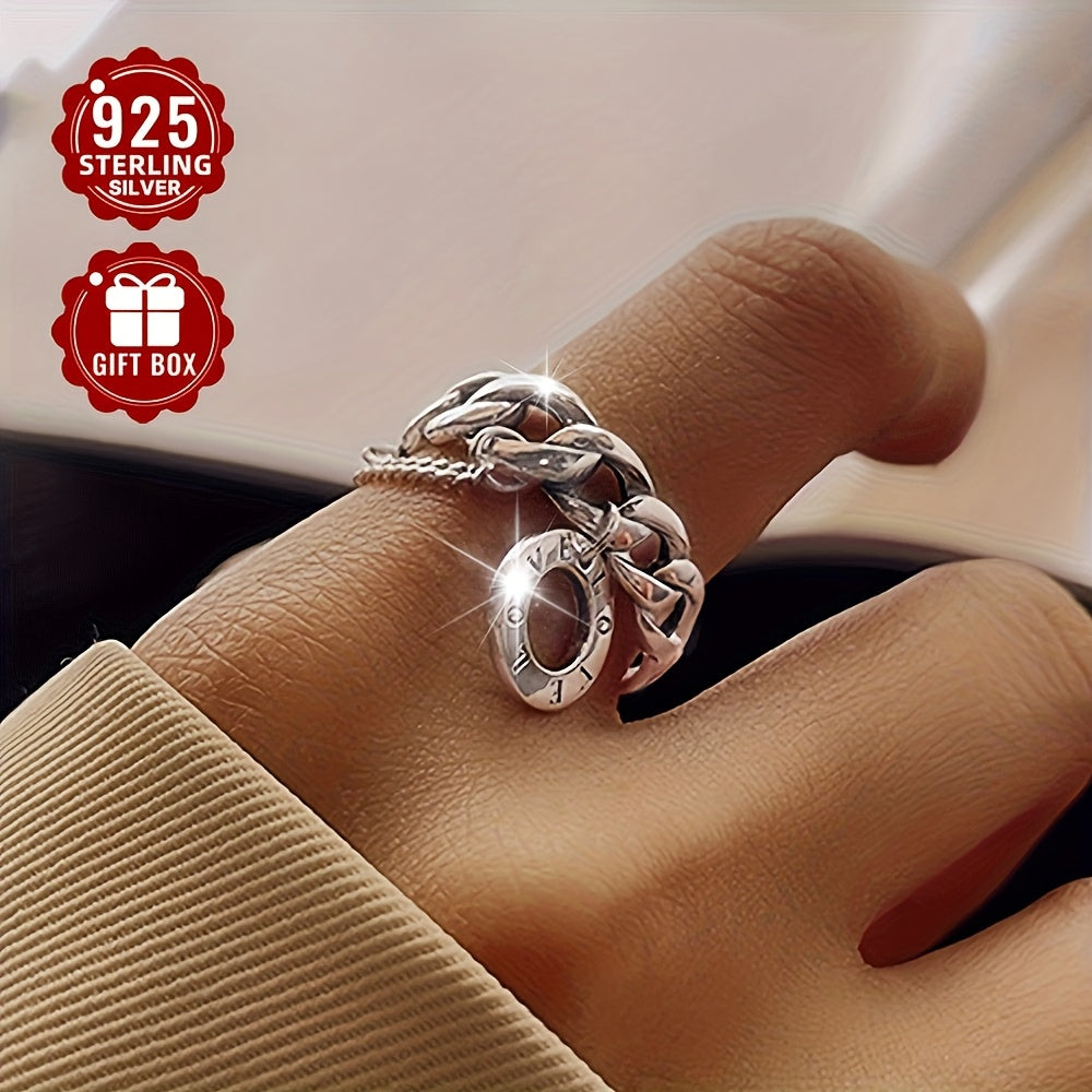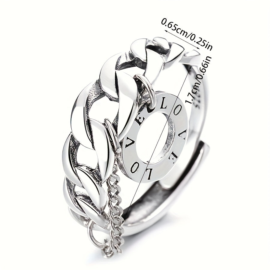 This open ring is made of hypoallergenic S925 sterling silver, featuring a round design with a LOVE chain. It is perfect for daily wear and makes a great gift choice. Embrace a unique and fashionable look with this minimalist ring.