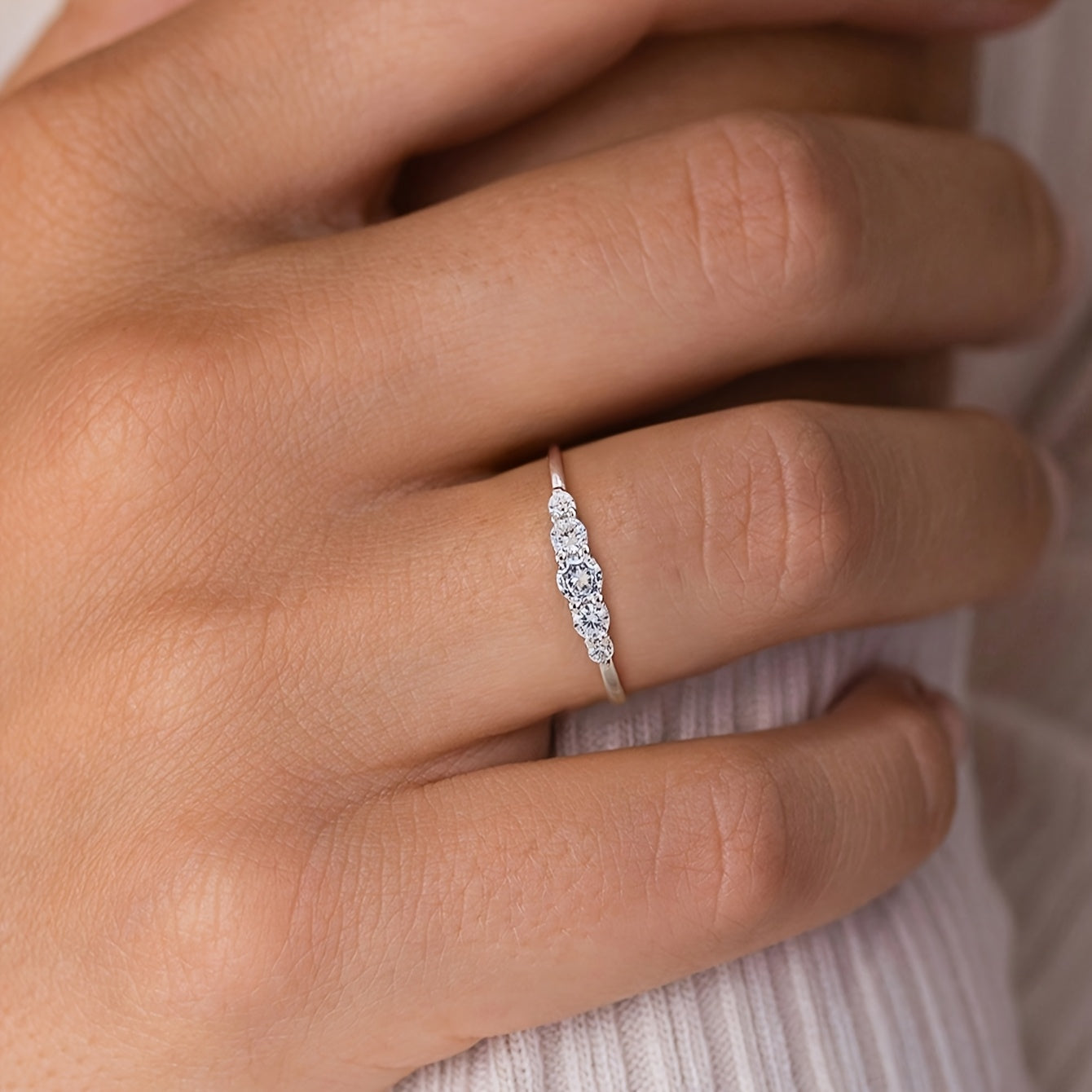 This elegant five stone ring is the perfect choice for a wedding or anniversary. Made of s925 sterling silver, it features synthetic gemstones that sparkle beautifully. A great gift for birthdays or Mother's Day.