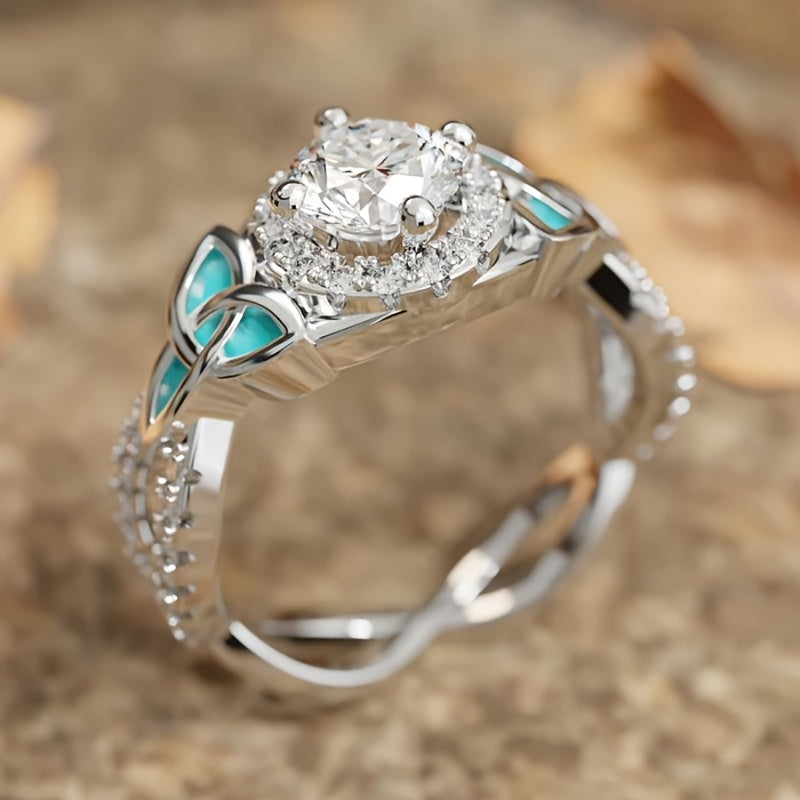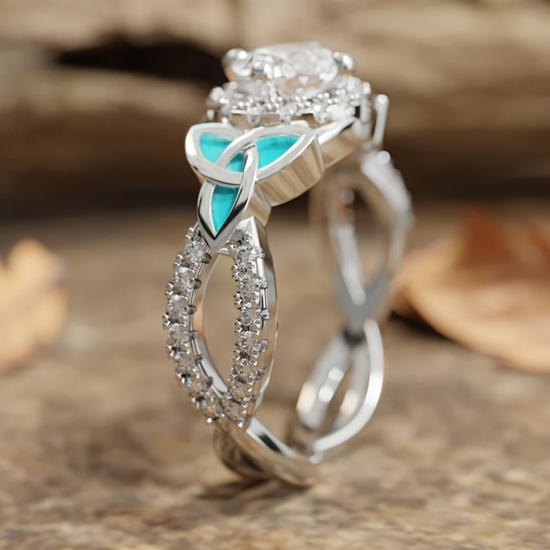 This stunning ring features synthetic zirconia stones set in an infinity design with enamel leaf and Celtic knot details. Perfect for everyday wear or special occasions.