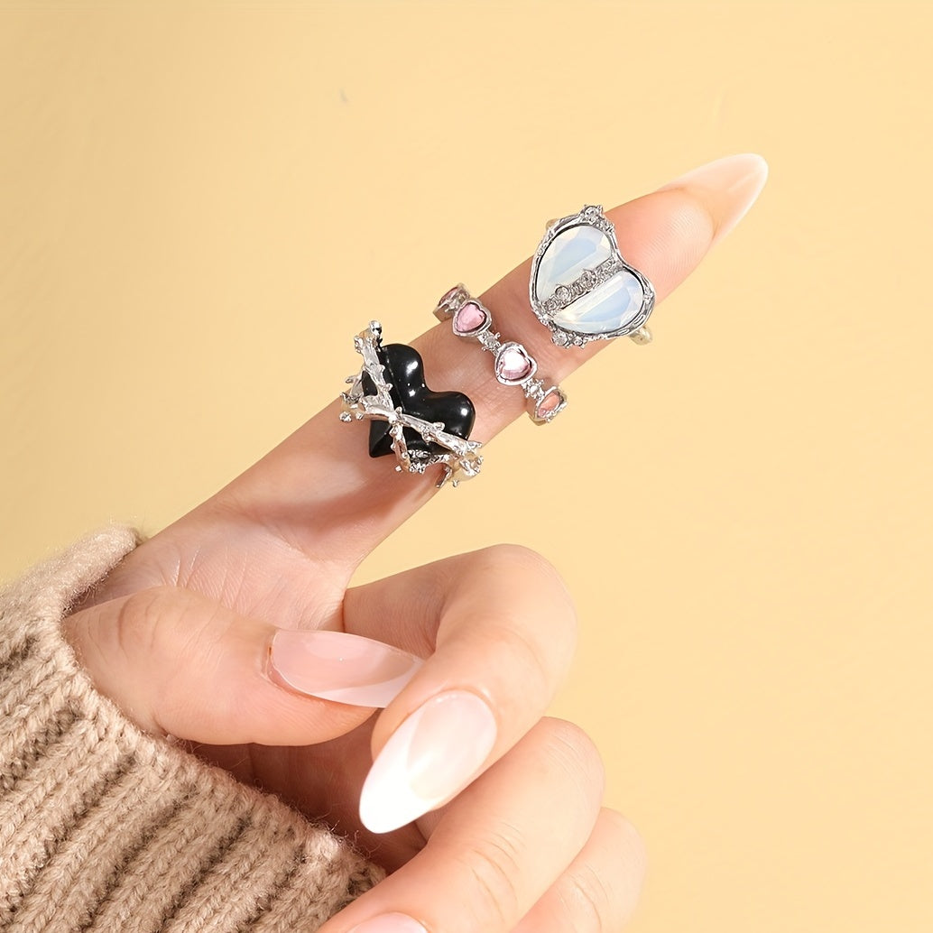 Y2k Sweet Heart Ring Inlaid Zircon Decor For Daily Outfits Lovely Gift