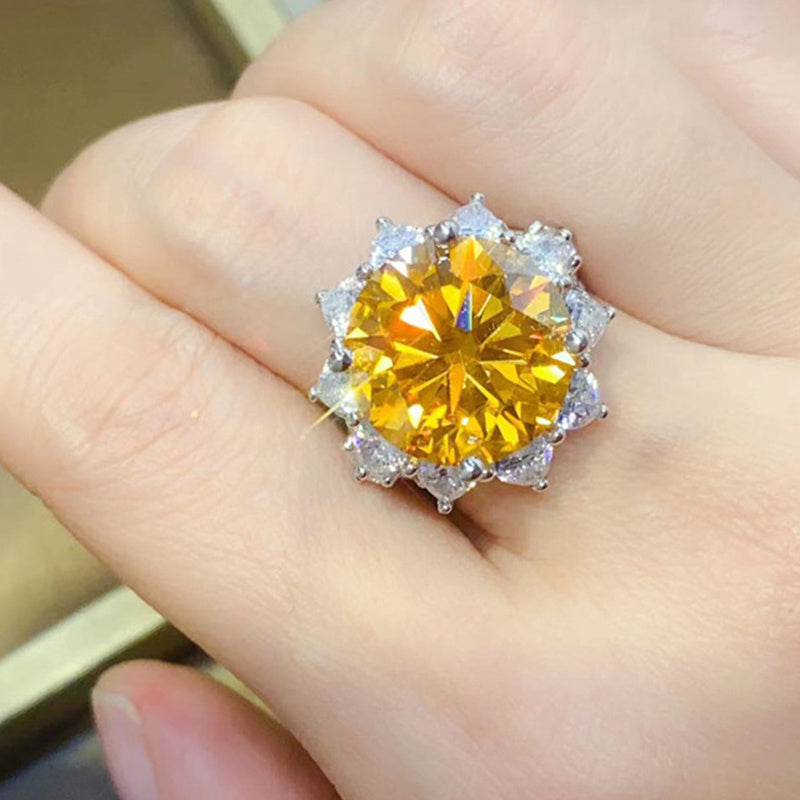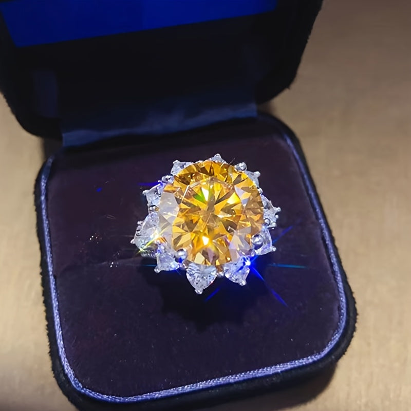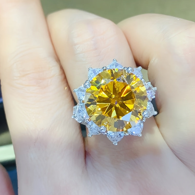 This stunning ring features a 10 carat D Moissanite set in S925 golden plating. It is designed to last with its ultra-all Moissanite material, making it perfect for engagement, proposal, or anniversary.