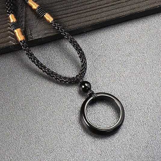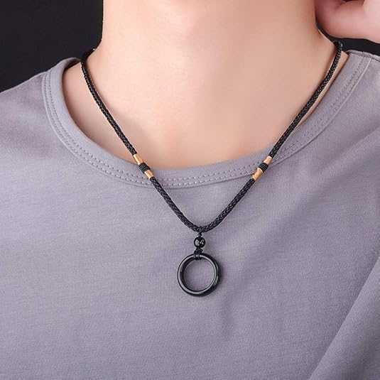 Le collier pendentif anneau noir en onyx pour homme est un accessoire remarquable, exprimant sophistication et masculinité. Au cœur du collier se trouve un pendentif anneau noir en onyx poli. Sa surface lisse et brillante capture magnifiquement la lumière, créant un contraste captivant avec la teinte noire profonde. Son design à la fois audacieux et sobre, avec ses lignes épurées évoquant une élégance moderne, symbolise l'unité et la force, ce qui en fait un ajout précieux à toute collection masculine. Le pendentif est suspendu à une élégante chaîne en corde noire, qui complète à merveille l'anneau en onyx. Sa texture unique ajoute de la profondeur au design, rehaussant son attrait visuel tout en conservant sa légèreté.